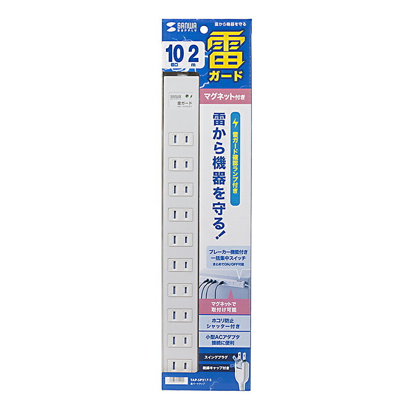 シャッター付き差込口でマグネットが装備された雷ガードタップ。一括集中スイッチ&ブレーカー付き。2P・10個口・2m。