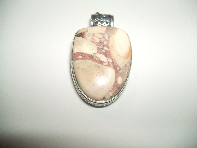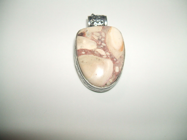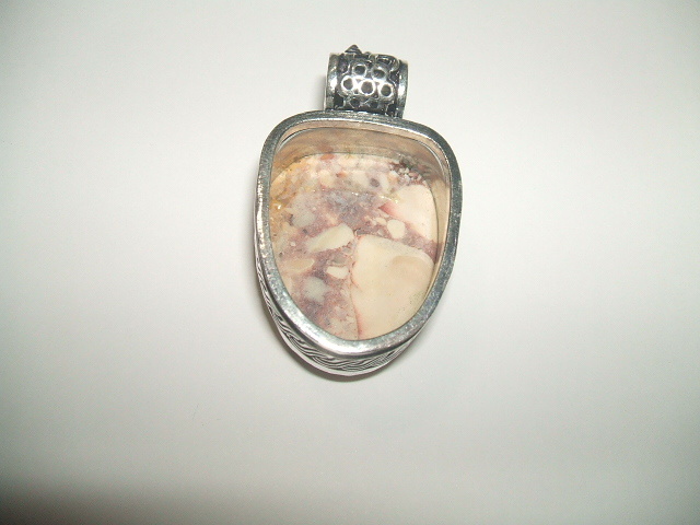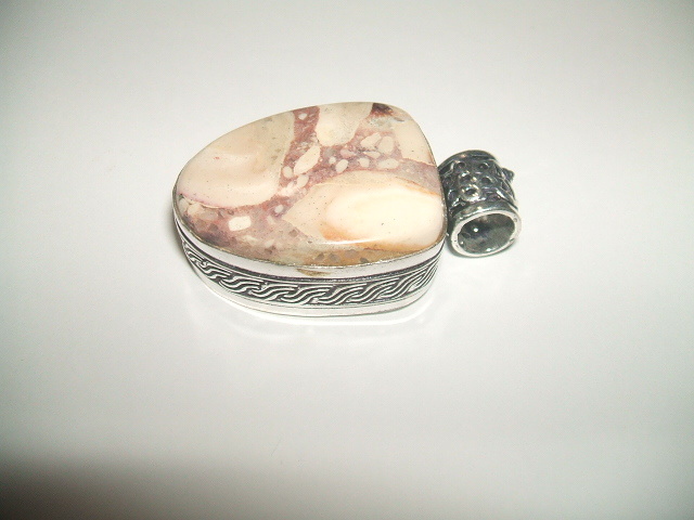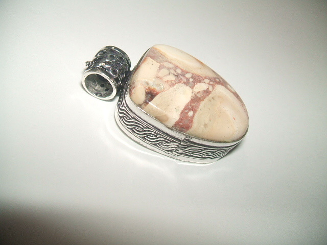 ジャスパーの中でもチョコレート色(こげ茶)が入った美しい模様が特徴のモッカイトトップです。石の大きさは3x2.1センチ。横長のバチカンの内径は直径約6ミリ。金属はシルバーですが、925の刻印が見つかりませんので、あらかじめご了承ください。落ち着いた色合いですが、大変存在感のあるトップです。こげ茶模様の色は写真では明るい茶色に写っていますが、実際はもう少し濃いこげ茶色になります。