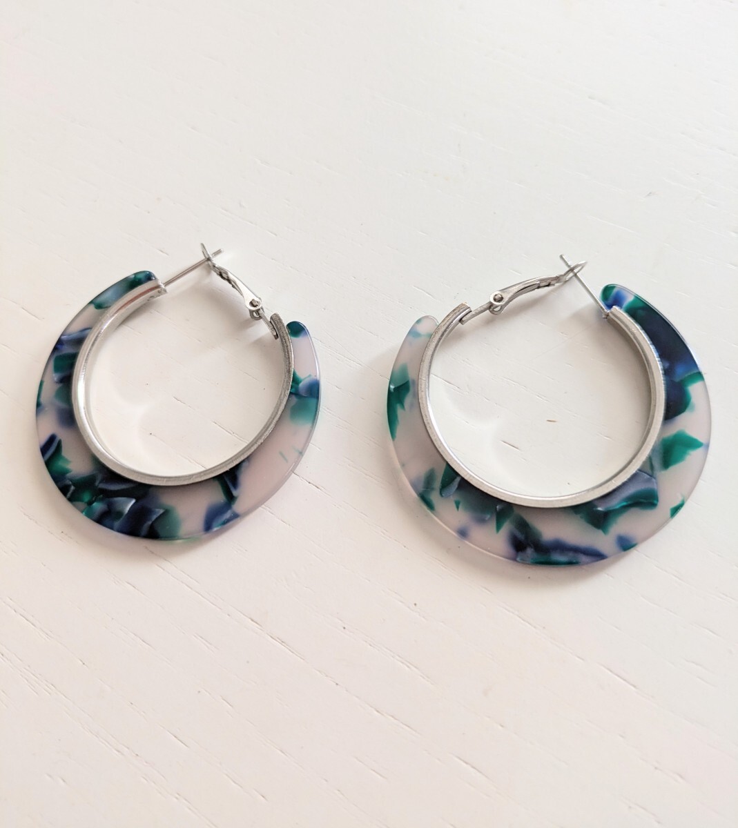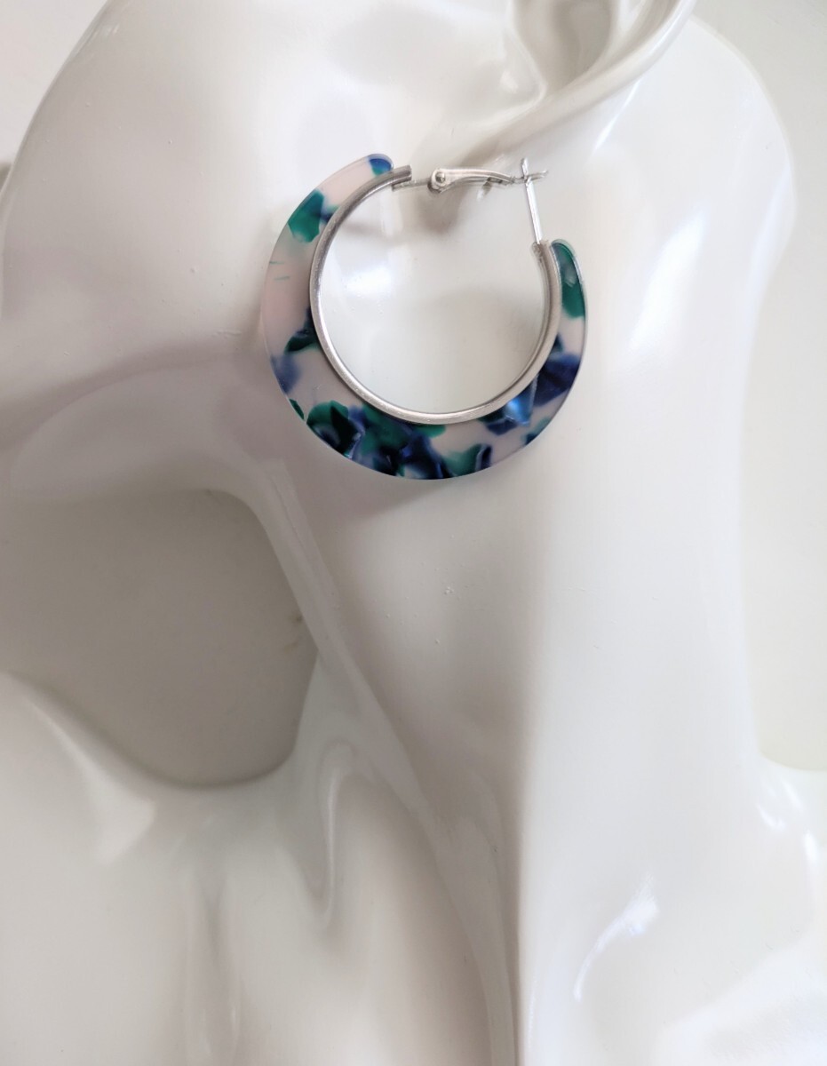 こちらは、新品未使用 ブルー×ホワイト 大理石風 フープピアス になります♪