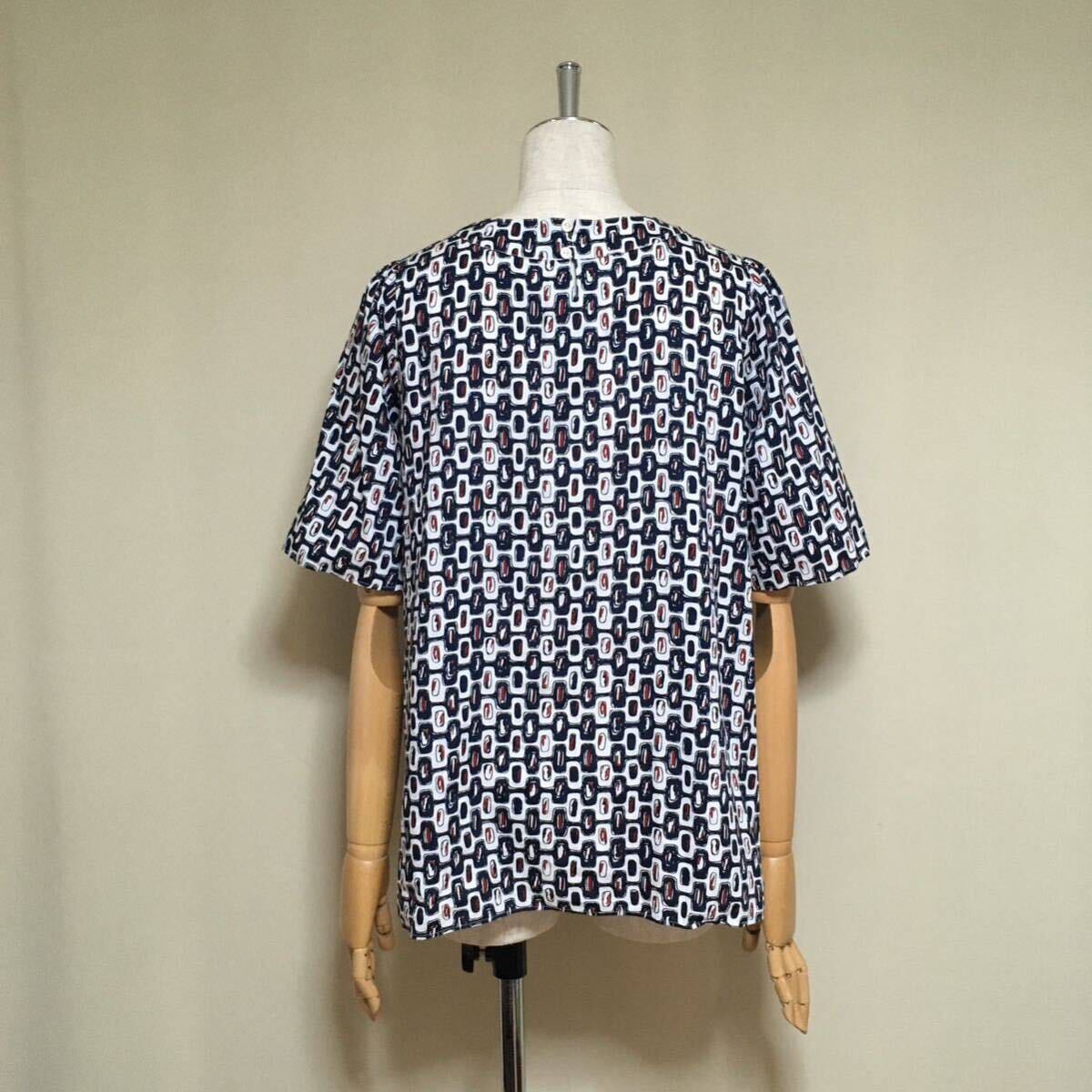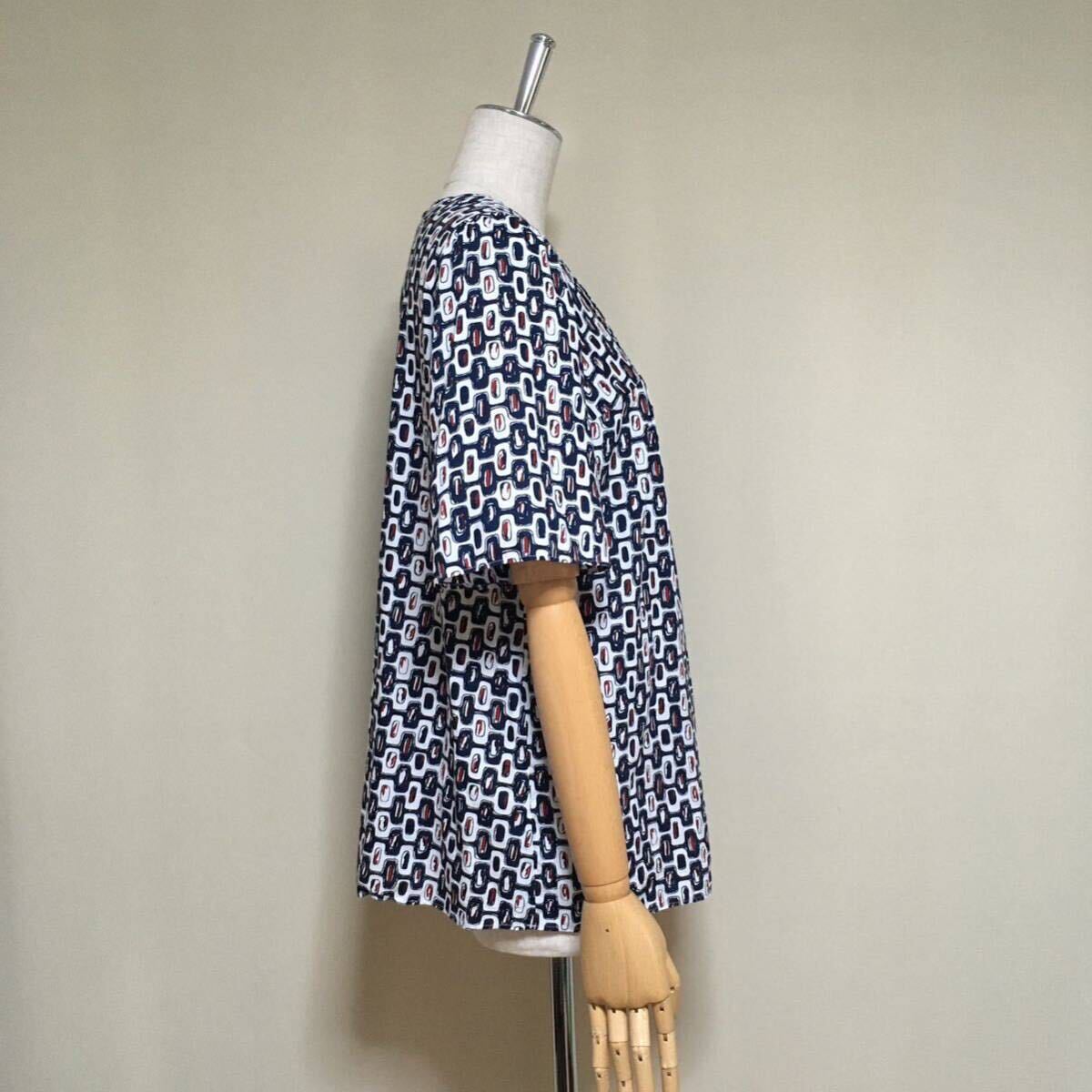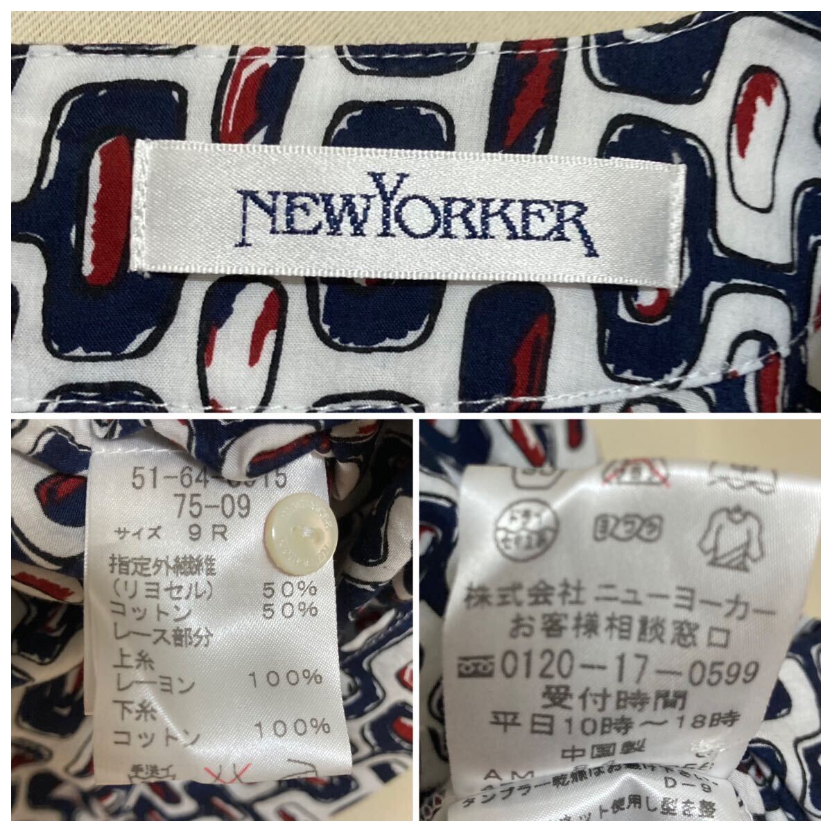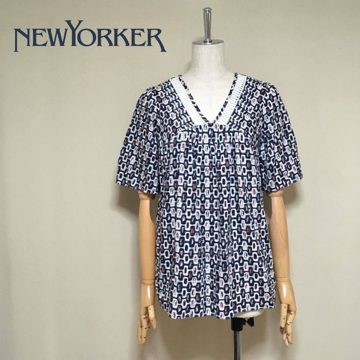 【美品】NEWYORKER ニューヨーカー 洗える レース Vネック 幾何学模様 半袖ブラウス 9号/Mサイズ相当 ネイビー レディース トップス