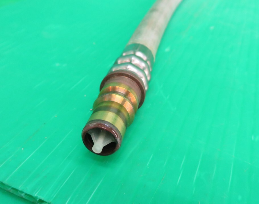 留め金がある方のホースに折れたような凹みがありますが当方で水漏れテストをしたところ、問題ありませんでした。