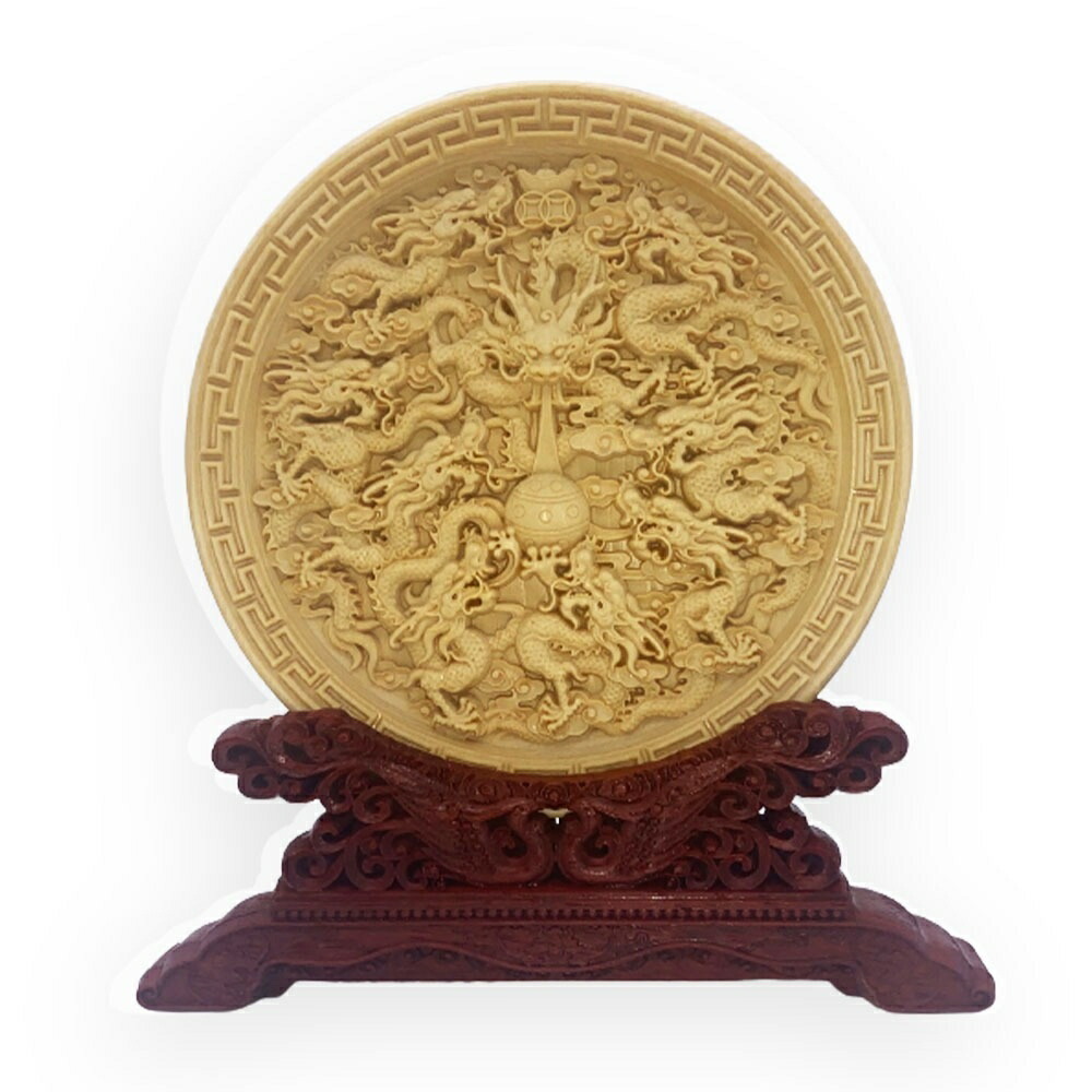 ミニ 九龍 竜生九子【円盤型龍彫り 台付き】極上彫り 円盤 木彫り 極上彫り 九龍 五本爪龍 風水 インテリア 彫刻 仏像 縁起物