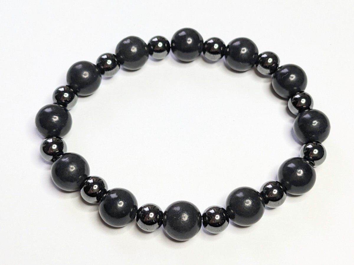 シュンガイトと磁気ヘマタイトを使用したストレッチ・ブレスレットです。