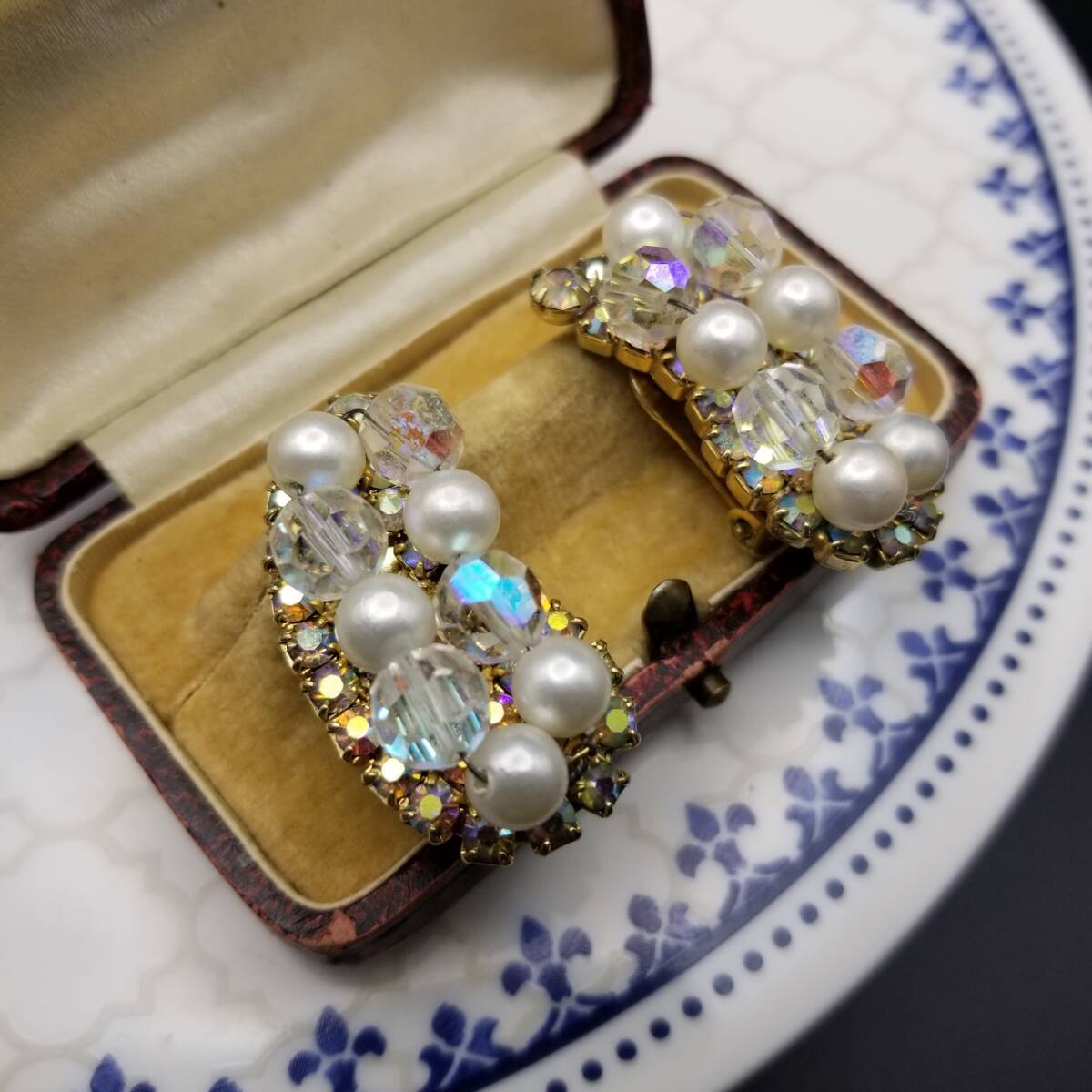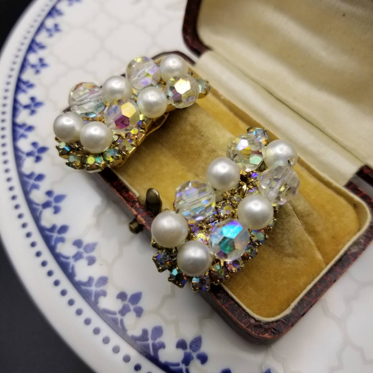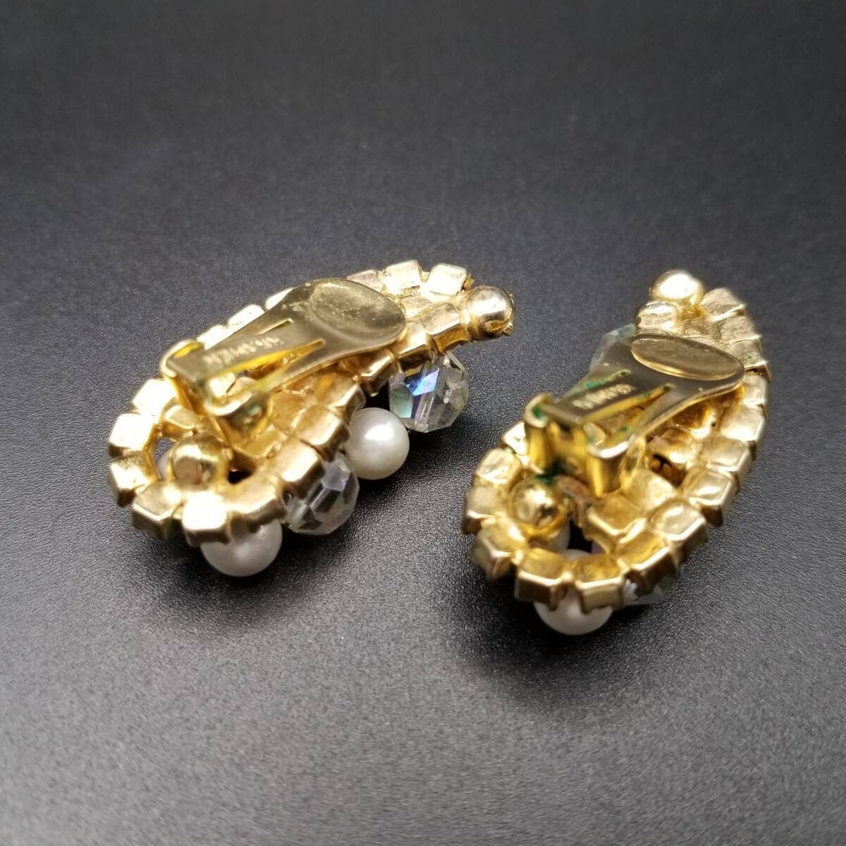 50'60's KRAMER パール/ラインストーン 装飾 エレガント ヴィンテージ クリップイヤリング 煌めき コスチュームジュエリー Y16-R