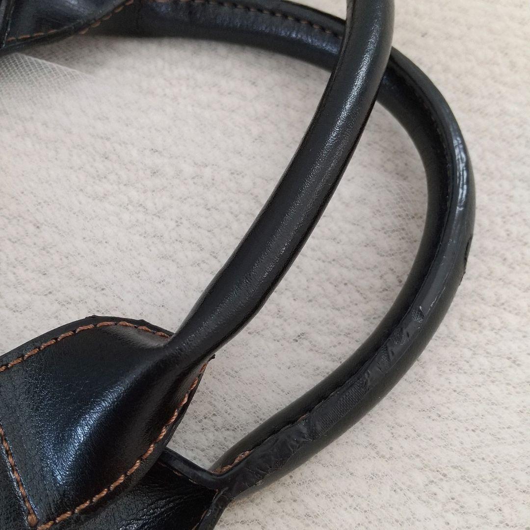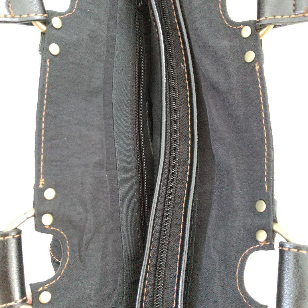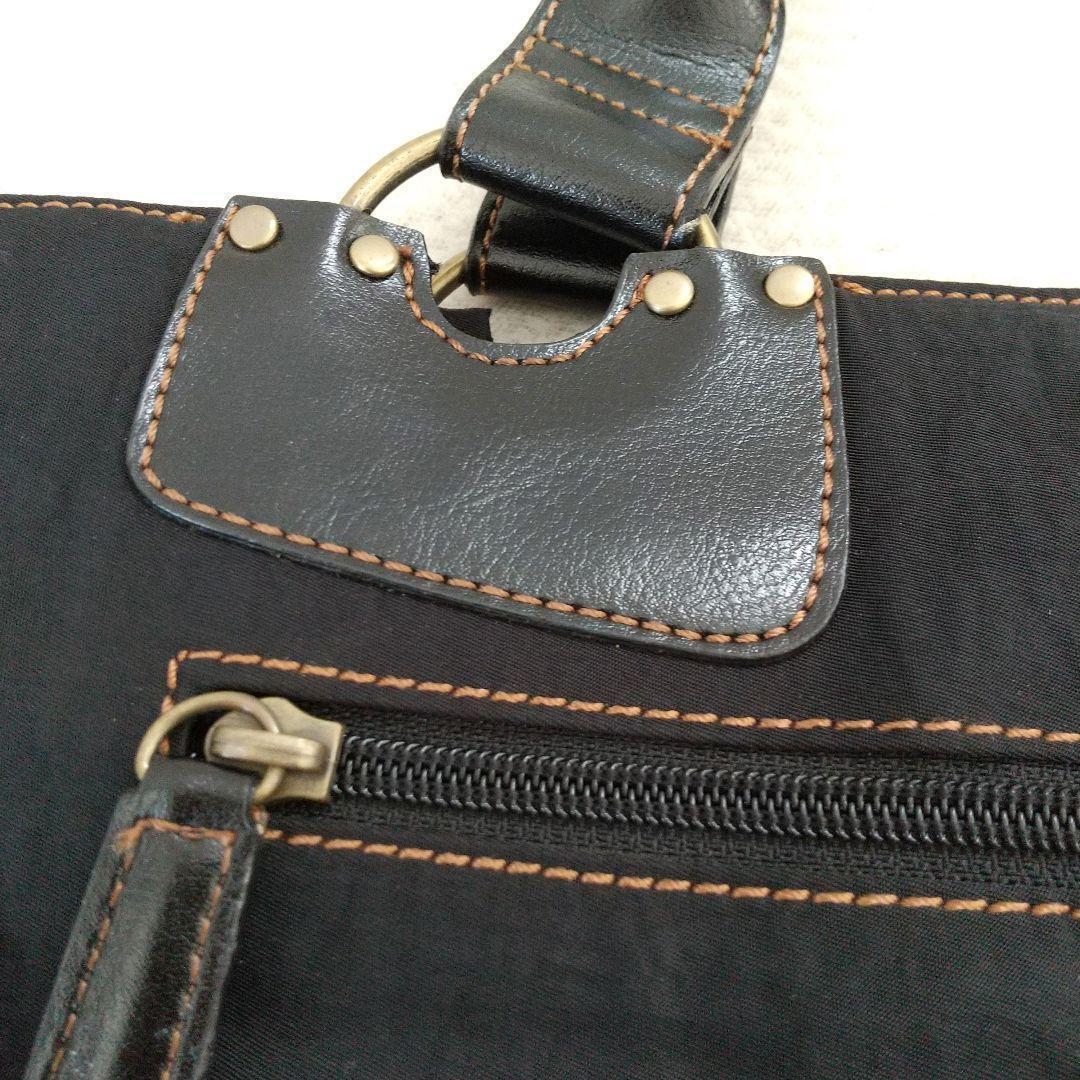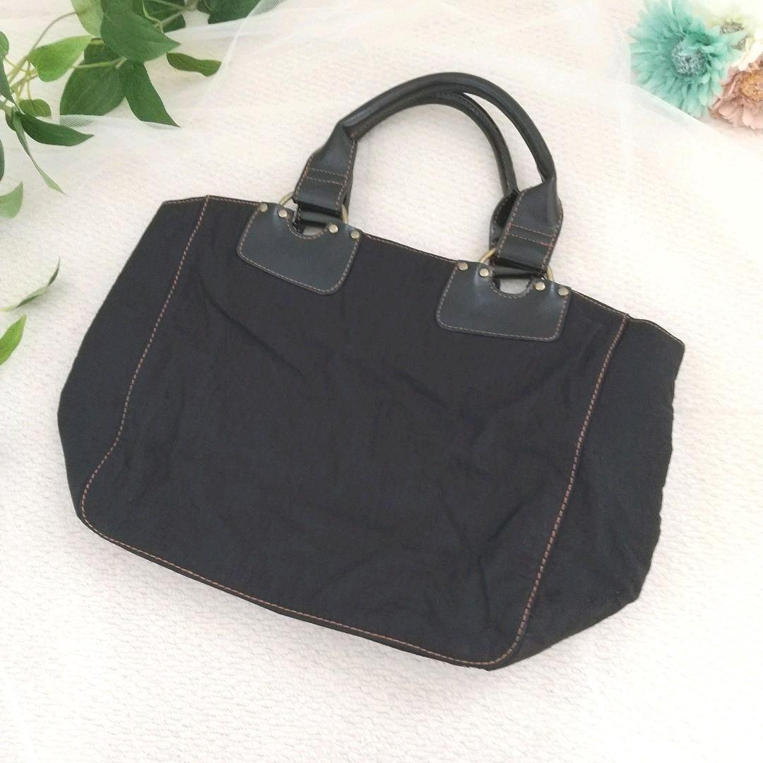 黒のバッグにブラウンのステッチが入った、カジュアルなハンドバッグです
