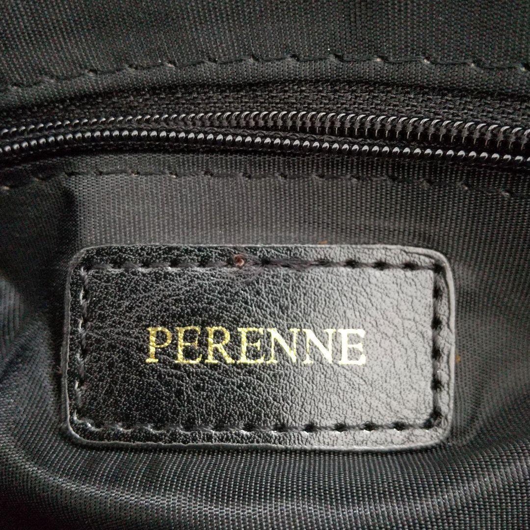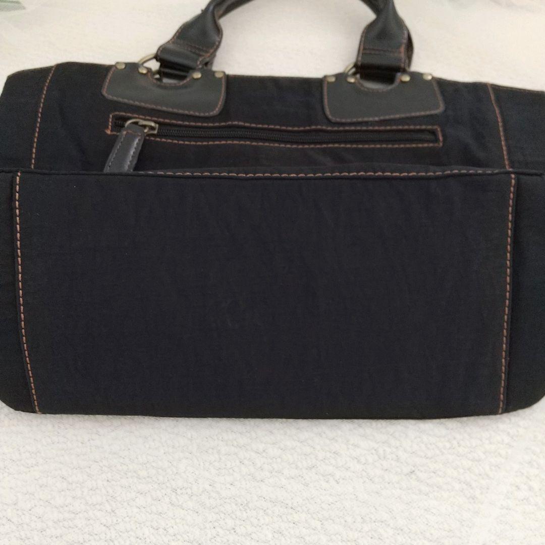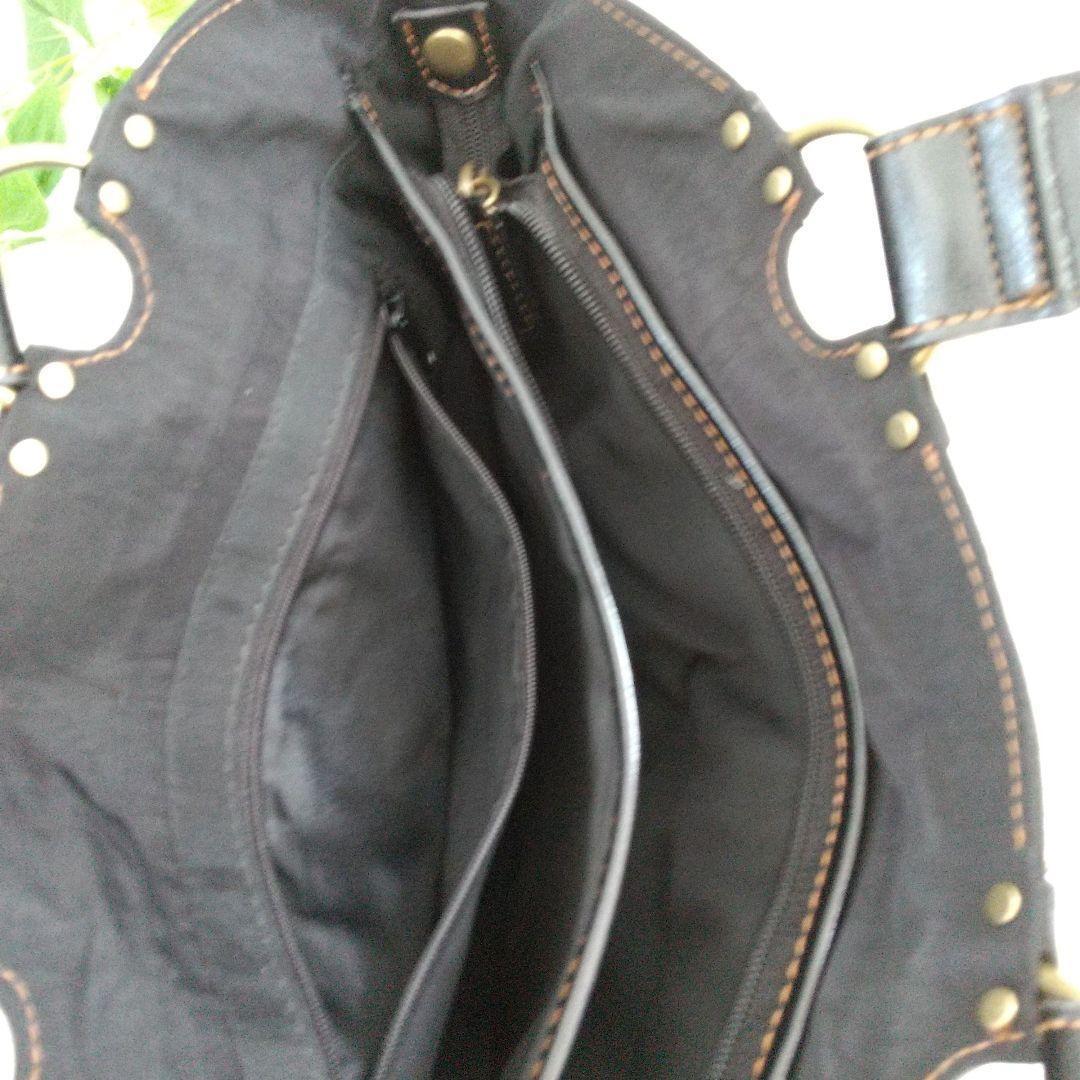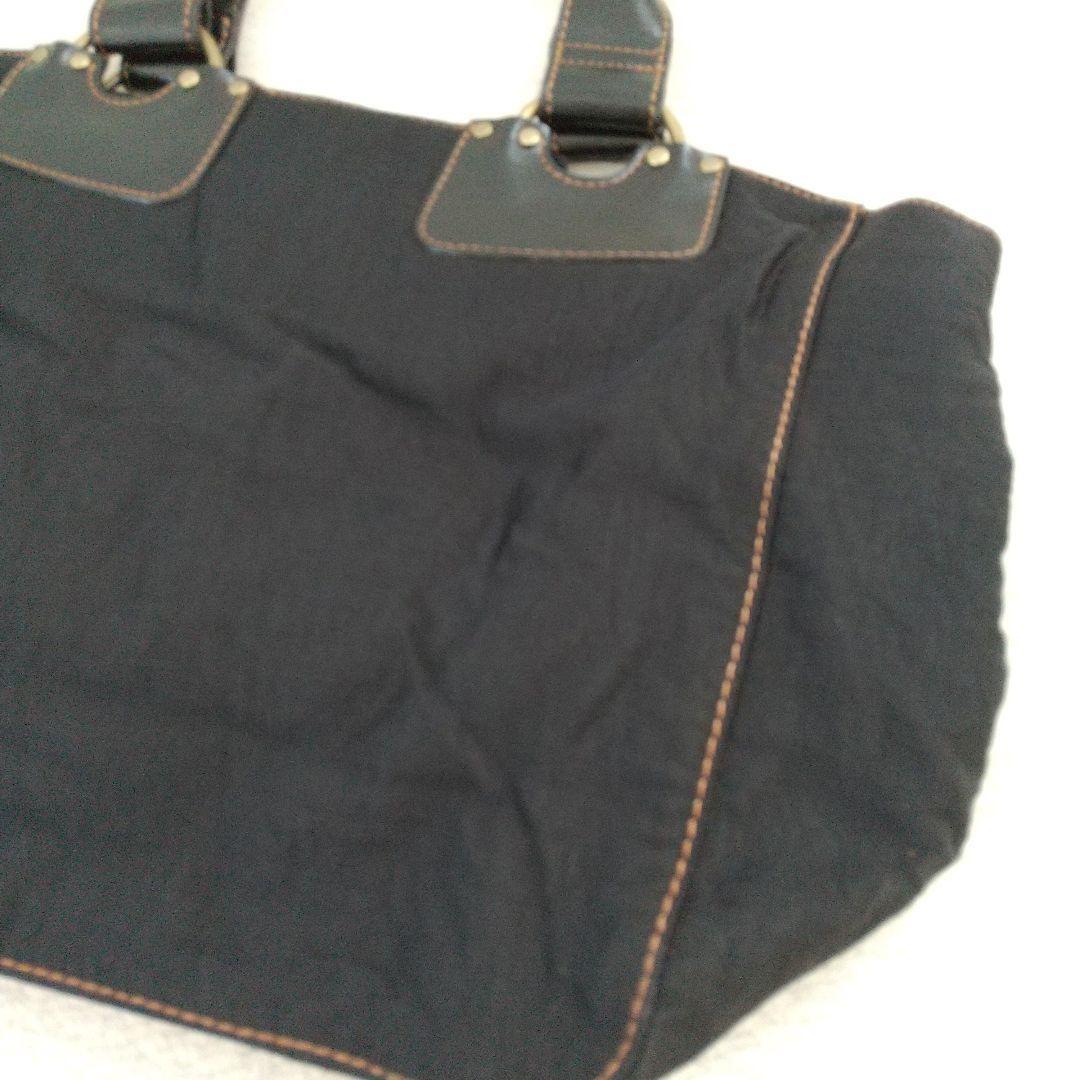 黒のバッグにブラウンのステッチが入った、カジュアルなハンドバッグです