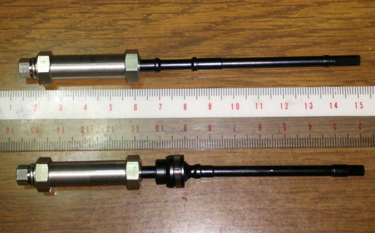 ■こちらは、タミヤ「OP-908 ★2,700 マイティフロッグ(2005)アッセンブリーユニバーサルシャフト 53908」の一部と「OP-913 ★800 マイティフロッグ(2005)アルミ・ホイールアダプター 53913」と適当なスペーサー、ワッシャをガチャガチャ組み合わせた某+35㎜の2倍の長さ、ワイド幅なのに、 緻密な設計と高価な最新機器、超高度な技術の結集により、高精度なステンレス一体型に仕上がり、必要最小限の部品点数で構成されており、 誰でも簡単に微調整など不要で、↑@ドッグボーンシャフトにもユニバーサルシャフトにも、 どちらでも取り付けられる様になっています。