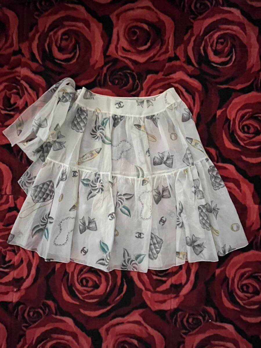 CHANEL☆シャネル ♪アイコンいっぱいsilk素材おリボン巻きスカート♪ミニ丈ワンピースの上にもOK!