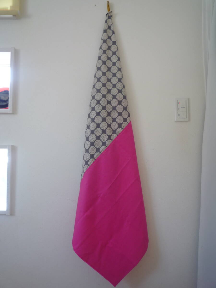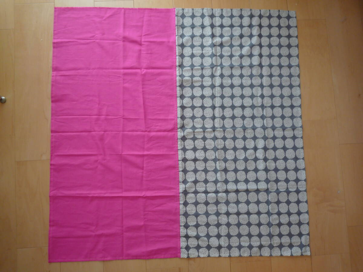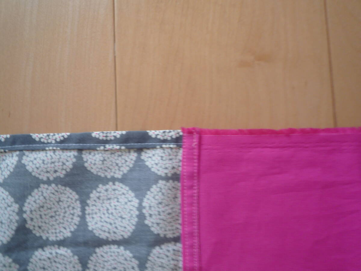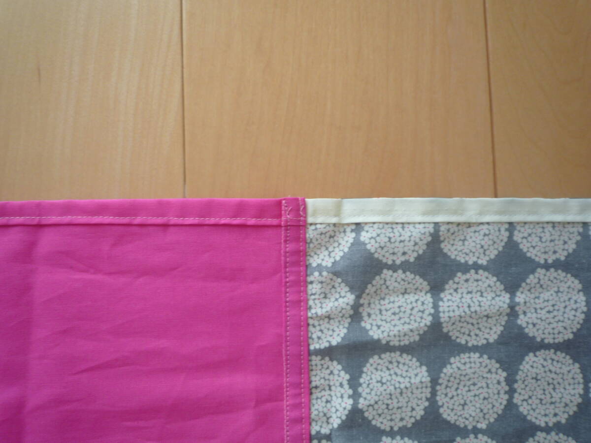 4辺のうち1辺の濃いピンク無地の生地のみ、生地の耳をそのまま生かしております。