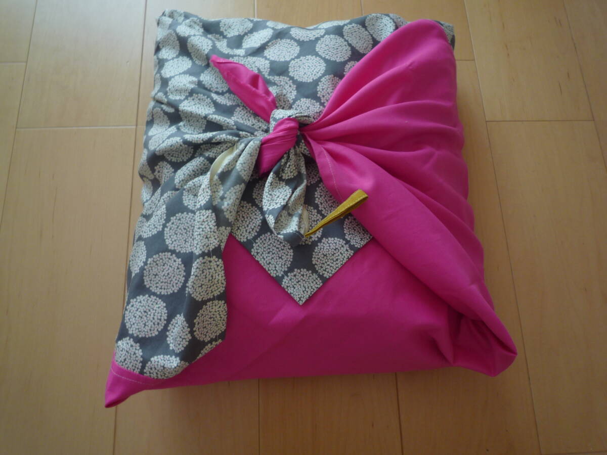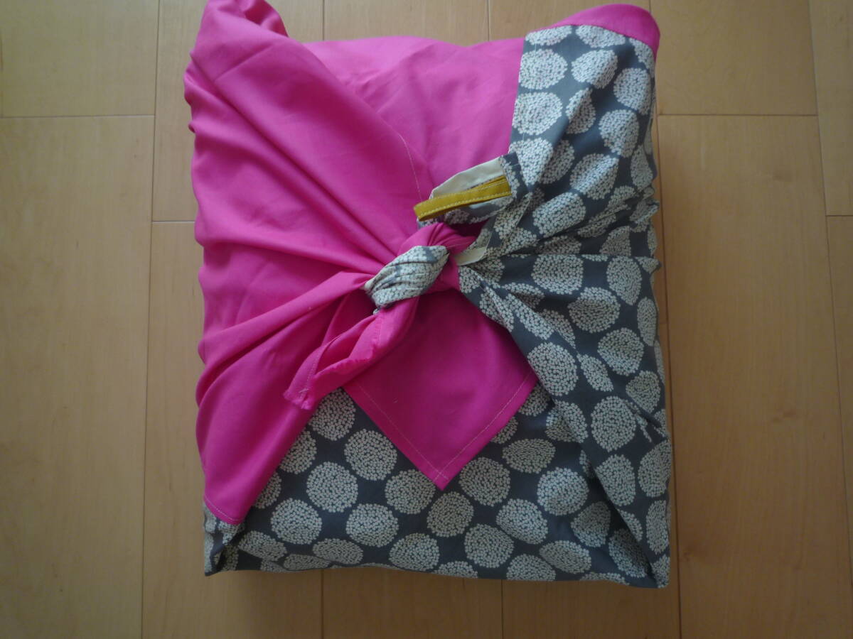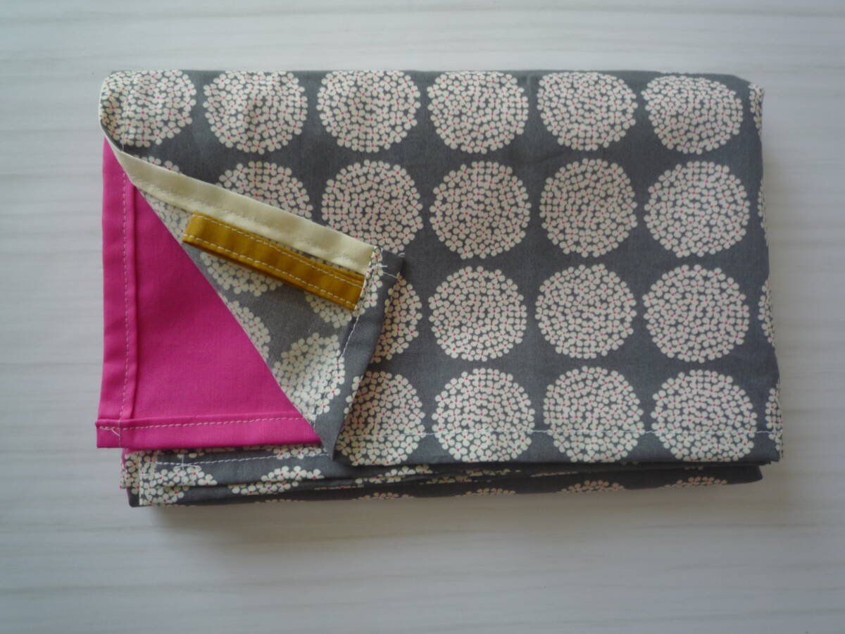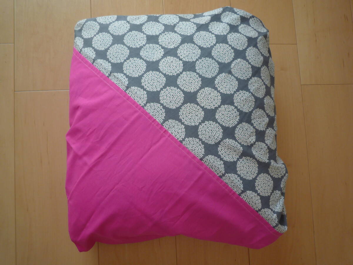 4辺のうち1辺の濃いピンク無地の生地のみ、生地の耳をそのまま生かしております。