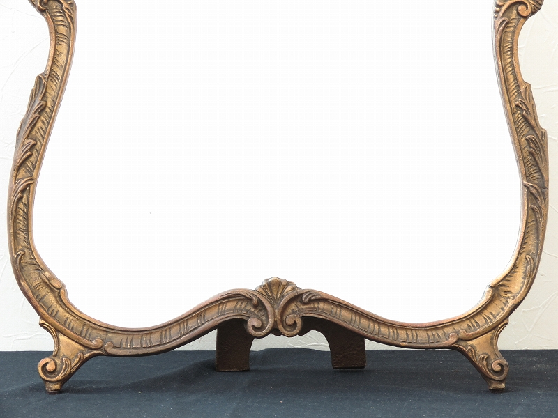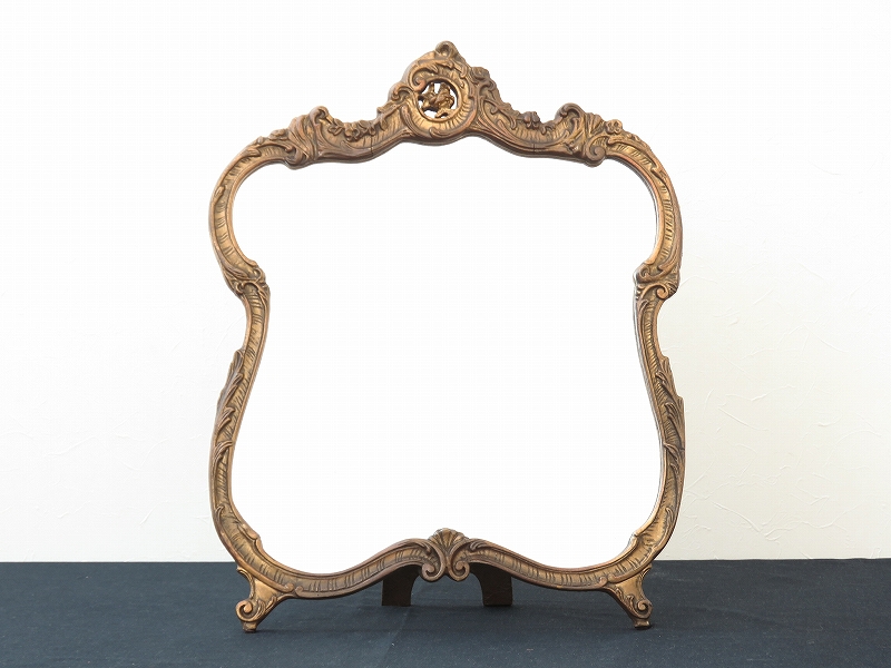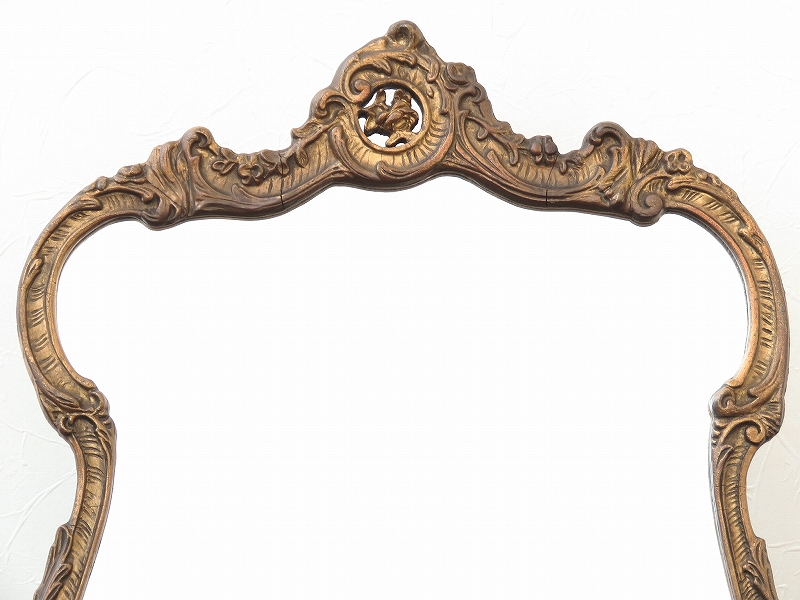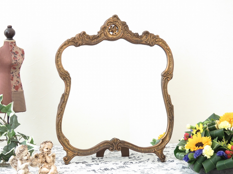 イギリスで買い付けた ATSONEA社 の古い木製の卓上ミラーです。透かし彫りの美しい彫刻が施された木製の枠には、落ち着いた風合いのゴールドのペイントがされています。