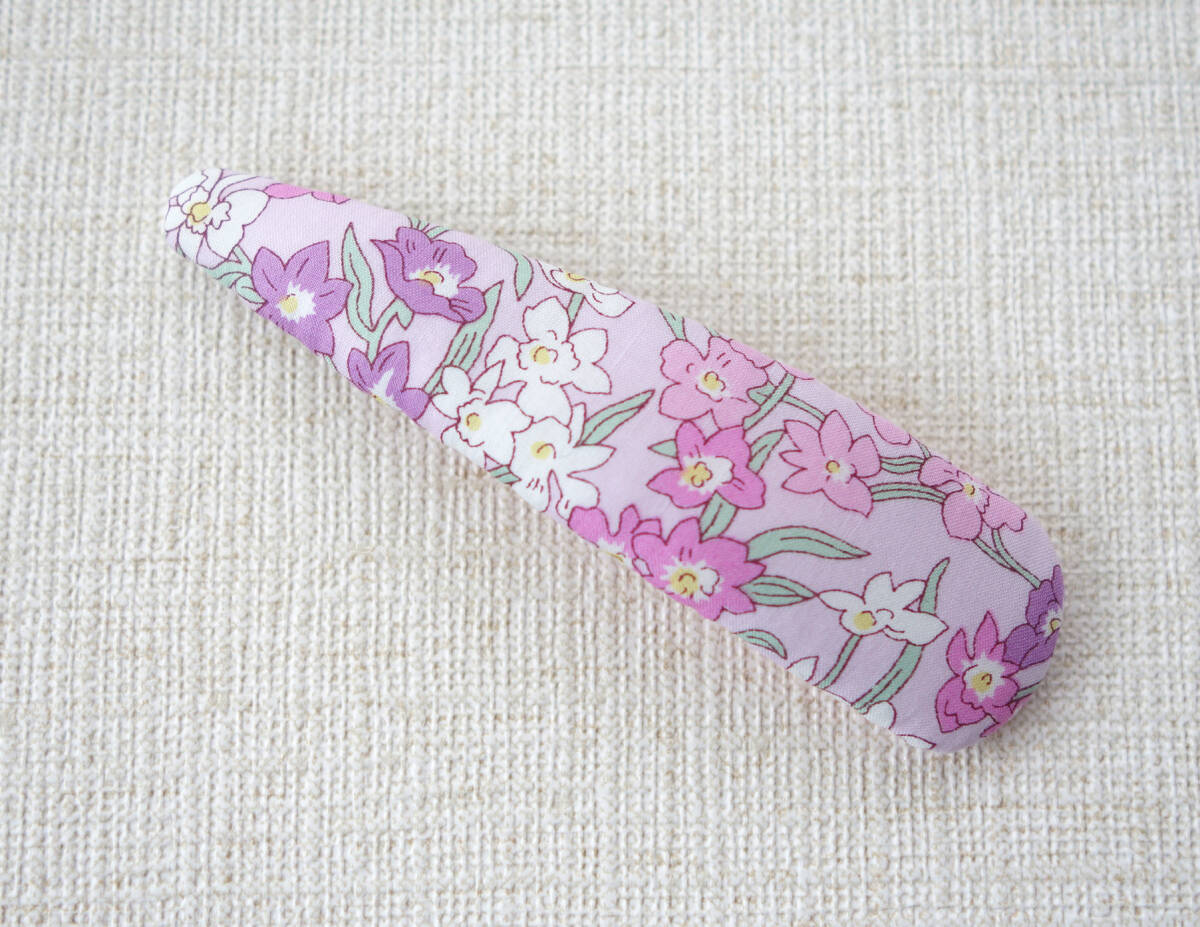 リバティプリントのタナローン(シーブロッサム・パープル系)でパッチンピンを作りました。