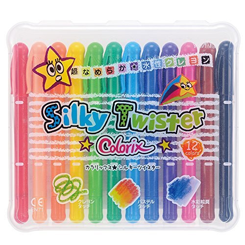 | カラリックスシルキーツイスター12色 CLST-12 サイズ W195×H175×D25mm 替針 12色:レッド・コーラルオレンジ・オレンジ・イエロー・ライトグリーン・グリーン・スカイブルー・ブルー・バイオレット・ピンク・ブラウン・ブラック 超なめらかな水性クレヨン12色セット。 水性クレヨンだから色を重ねても発色がキレイ。 パステルのように指やティッシュでぼかしたり、水を使ってぼかしたり描く楽しみが広がります。 芯はペン後部を回して出し入れする繰り出し式です。 |