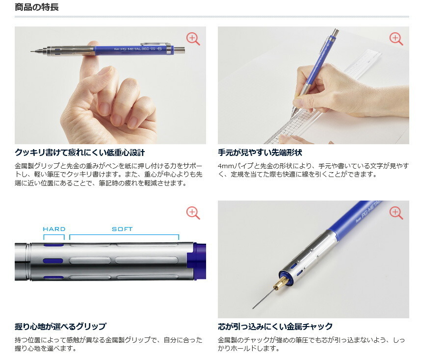 金属製グリップと先金の重みがペンを紙に押し付ける力をサポートし、軽い筆圧でクッキリ書けます。また、重心が中心よりも先端に近い位置にあることで、筆記時の疲れを軽減させます。