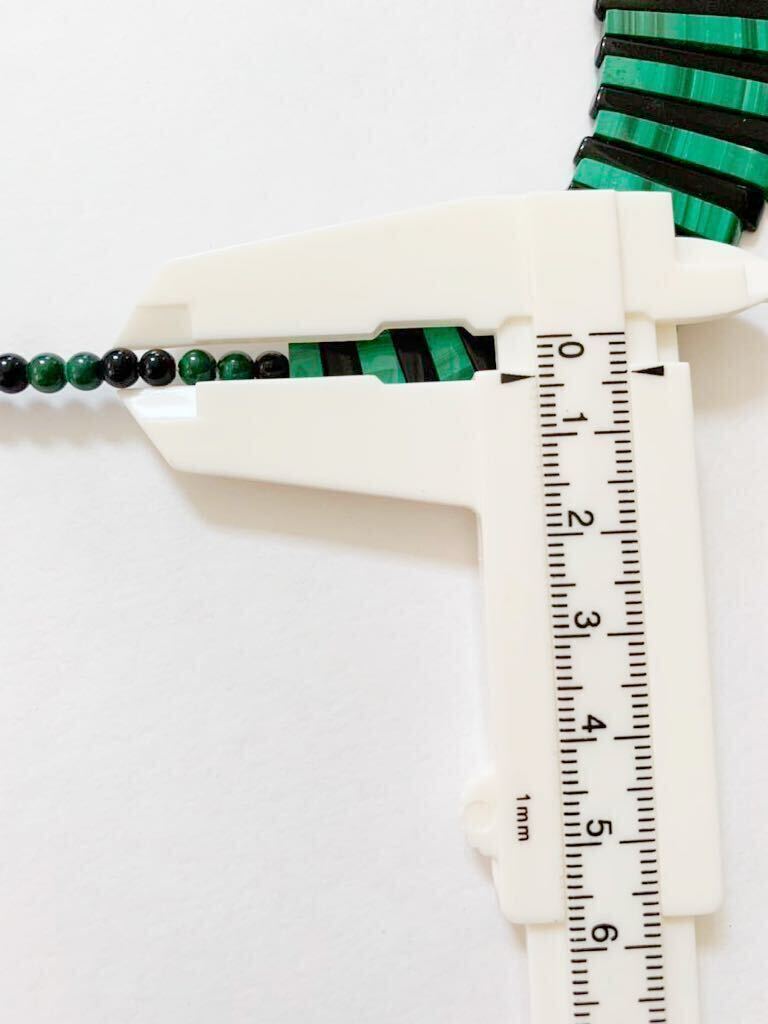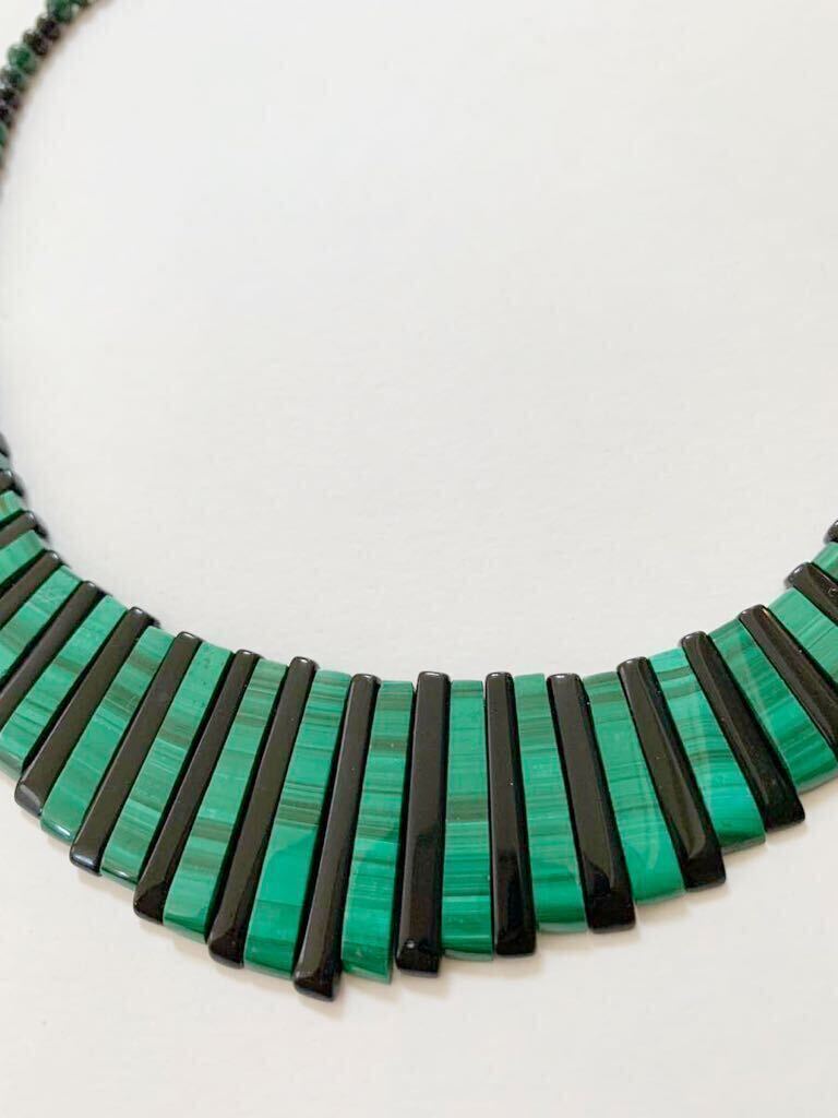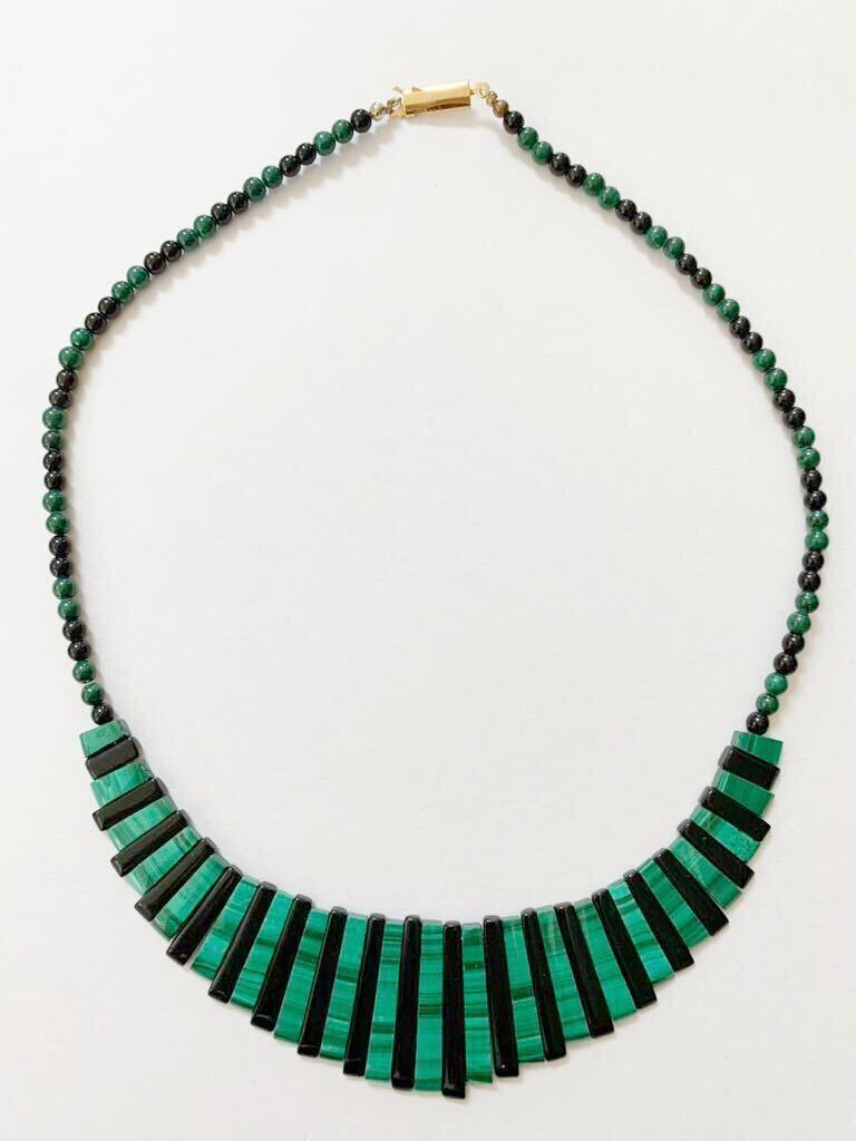 美しく研磨されたマラカイトとオニキスがピシッと整列している様子、ボールビーズの方は、2個ずつ配列されており、こちらのネックレスの持つ美しさがしっかりと計算されたデザインであることわかります。斬新で気品を感じさせる雰囲気があり、現代のファッションに取り入れてみたくなる個性の光るネックレスではないでしょうか。