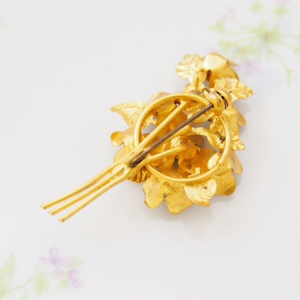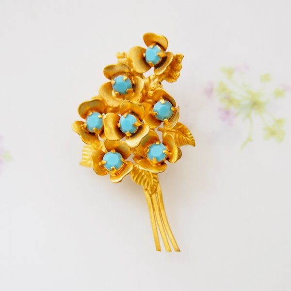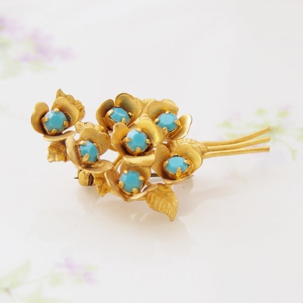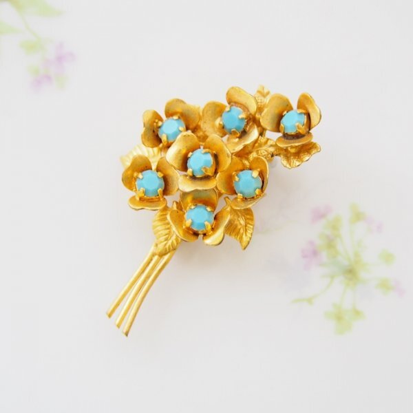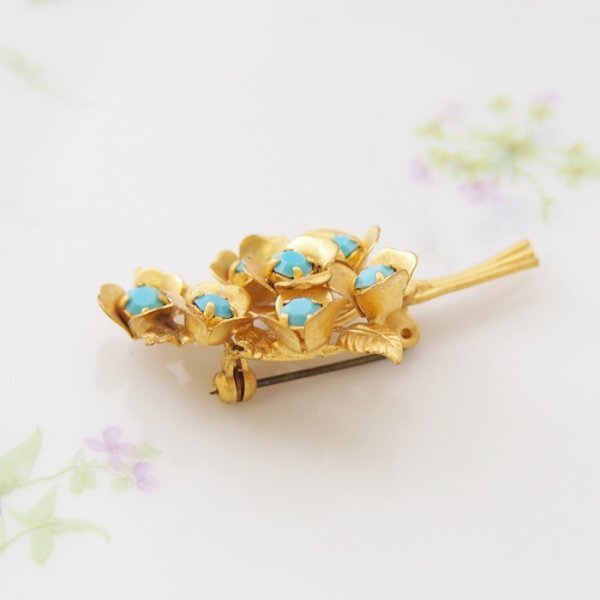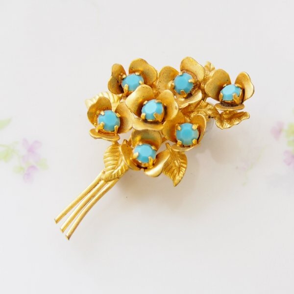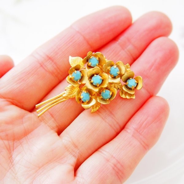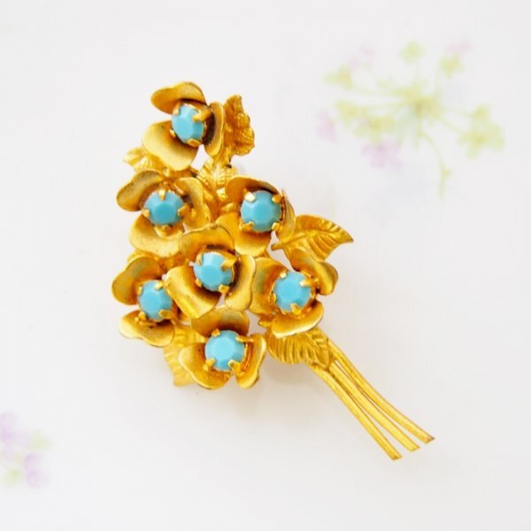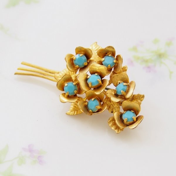 ブルーラインストーンのフラワーモチーフのブローチです。 小さなお花が束ねられた花束のデザイン。 お花の中心にはターコイズブルーのラインストーンがセットされています。 お洋服以外にも帽子や鞄のアクセントにもどうぞ。 経年の為、金属部分に多少の小キズやスレが見られます。 ピンの部分は全体的に黒ずんでいます。 ■ブランド: UNSIGNED ■刻印: なし ■年代(推定): 1950-60年代頃 ■輸入国: イギリス ■サイズ: 約4cmx約2.8cm ■重量: 約6g アンティーク・ヴィンテージ商品には、経年による傷や劣化などがあります。 目立つものはアイテムの詳細に記載しておりますが、説明以外にもキズや損傷などがある場合がございます。 古いものですので、ご理解いただける方のみご入札下さいませ。 他サイトでも販売しておりますので、同時にご注文があった場合は、品切れの場合もあります。その場合は、大変申し訳ございませんが、ご注文をキャンセルとさせて頂きます事をご了承くださいます様お願いいたします。 | |||