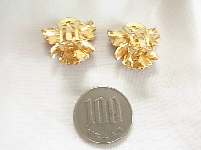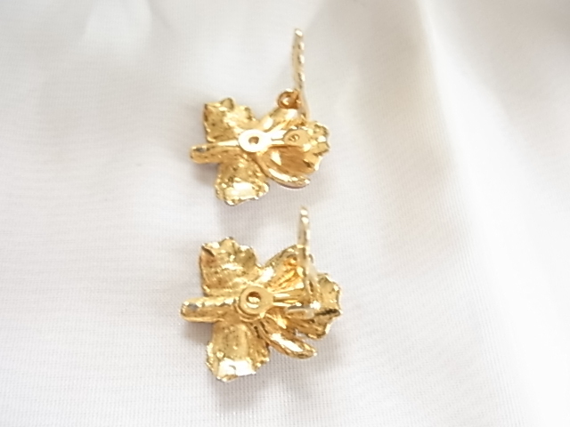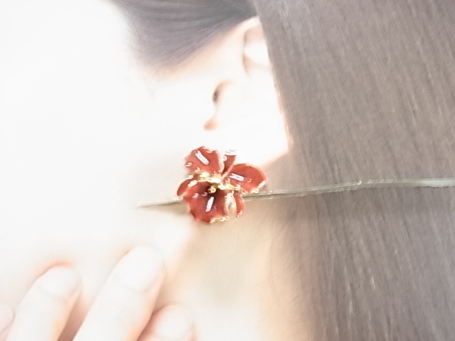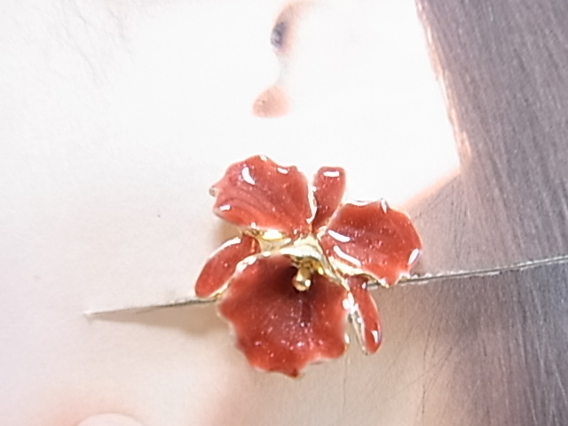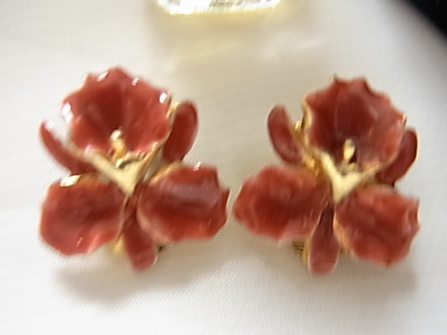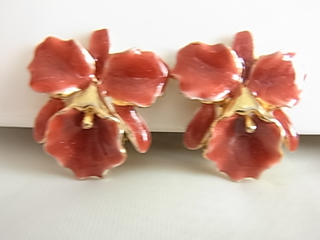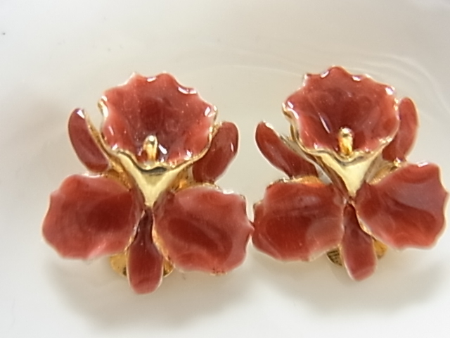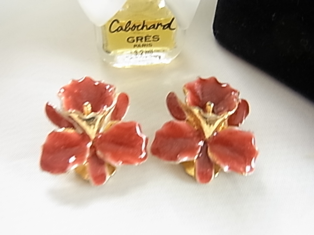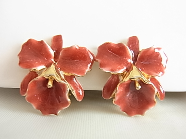 ビンテージ/ヴィンテージ 綺麗なターキーレッドトーン 赤系のブーゲンビリアみたいなお花のモチーフが素敵 エナメル装飾 イヤリング▽