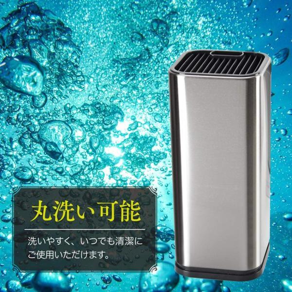 黒とシルバーの洗練されたカラーデザインです。小物収納機能つき。スタンドには包丁だけでなく、箸やアイスピックなど、様々な調理用品が収容できます。まるごと水洗いができるのでとっても衛生的です。