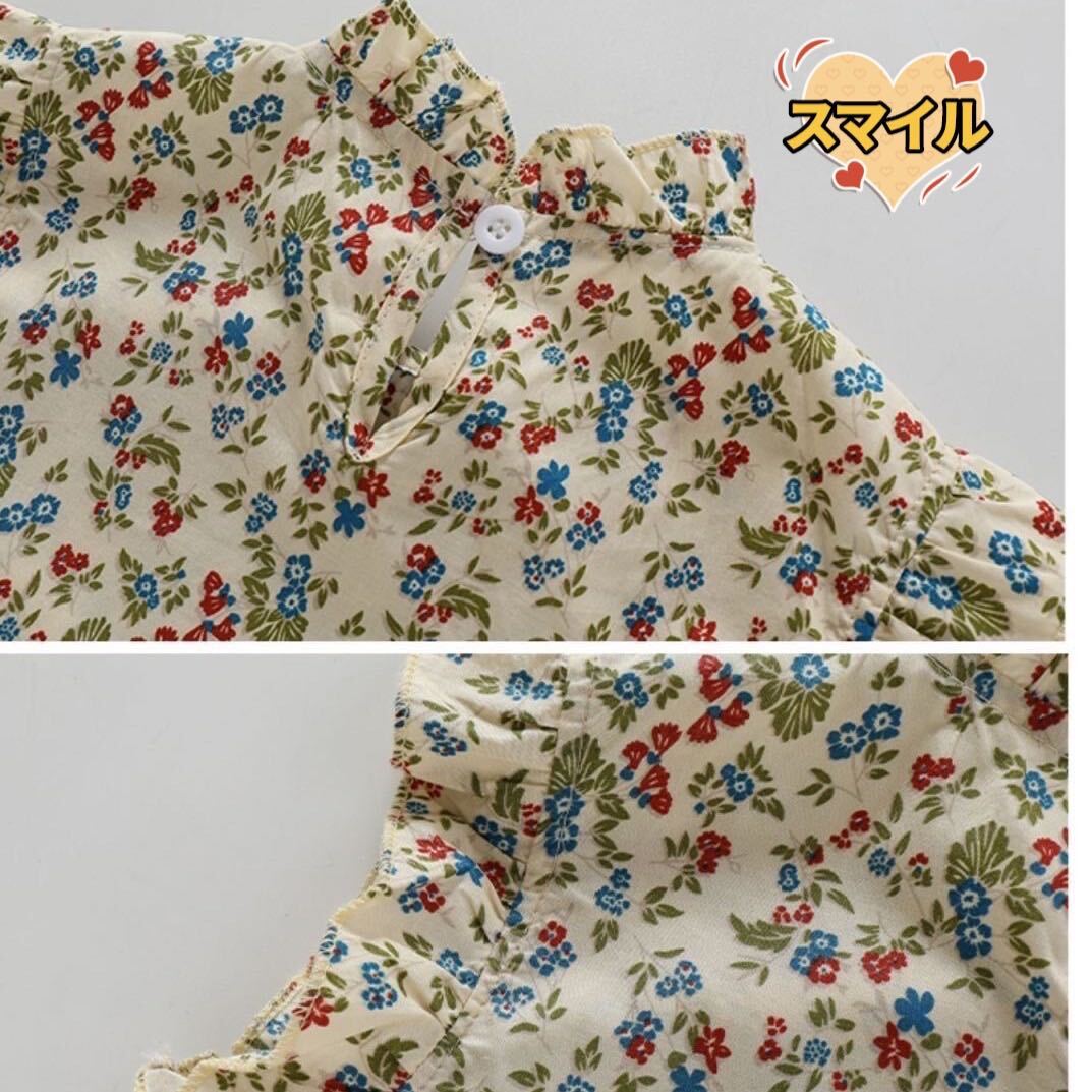 可愛いフリルの襟、袖と花柄でお子様の可愛さを引き出してくれました