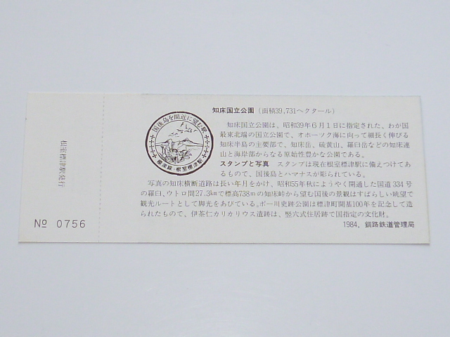 記念切符★知床国立公園指定20周年記念★羅臼岳とポー川史跡公園★釧路鉄道管理局★1984年★根室標津駅★0756