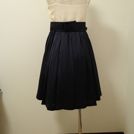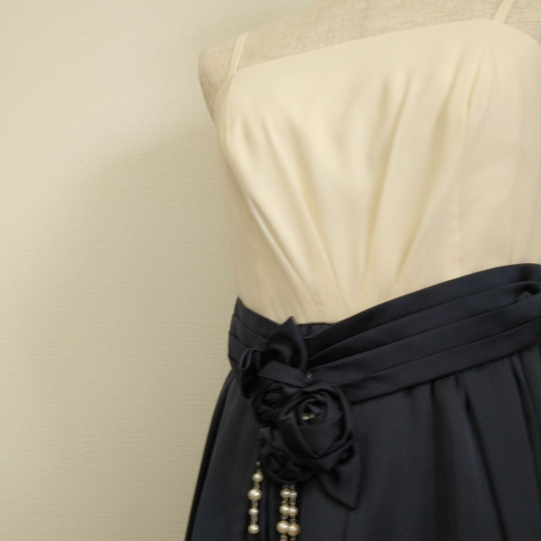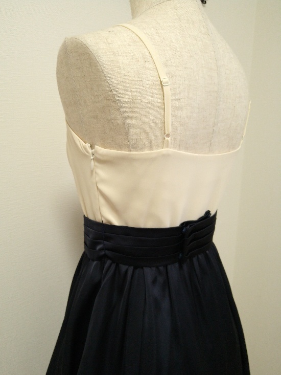 上半身は白、スカート部分はネイビー。生地はサテンになると思います。