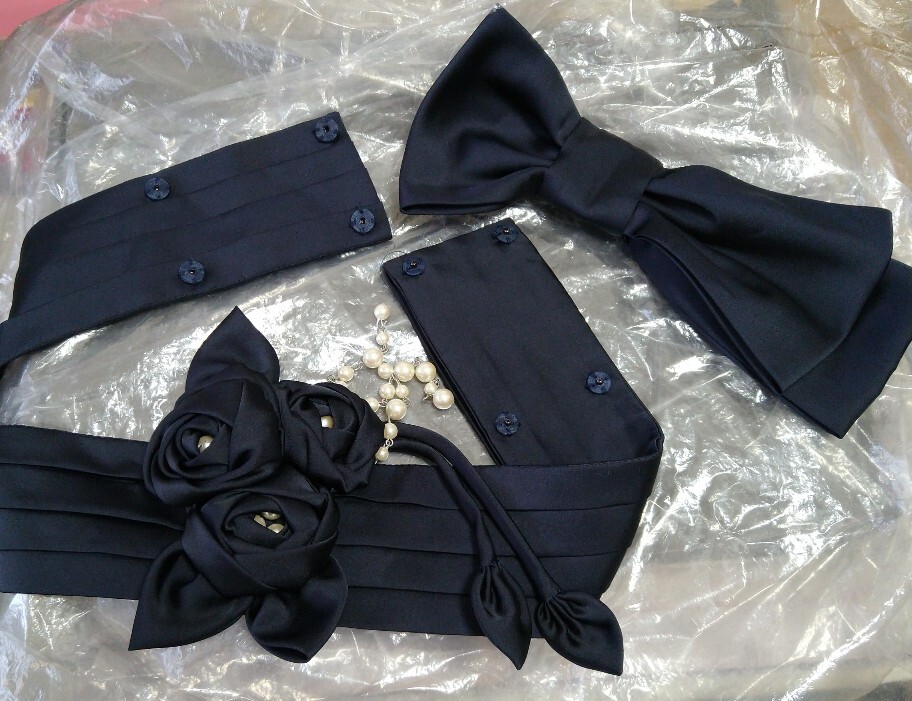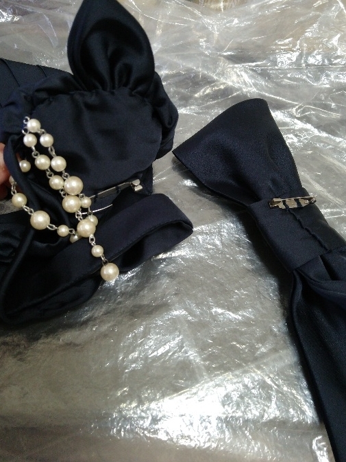 写真1、2、9では小さなバラ3つの飾りを、ベルトに安全ピンでつけています。