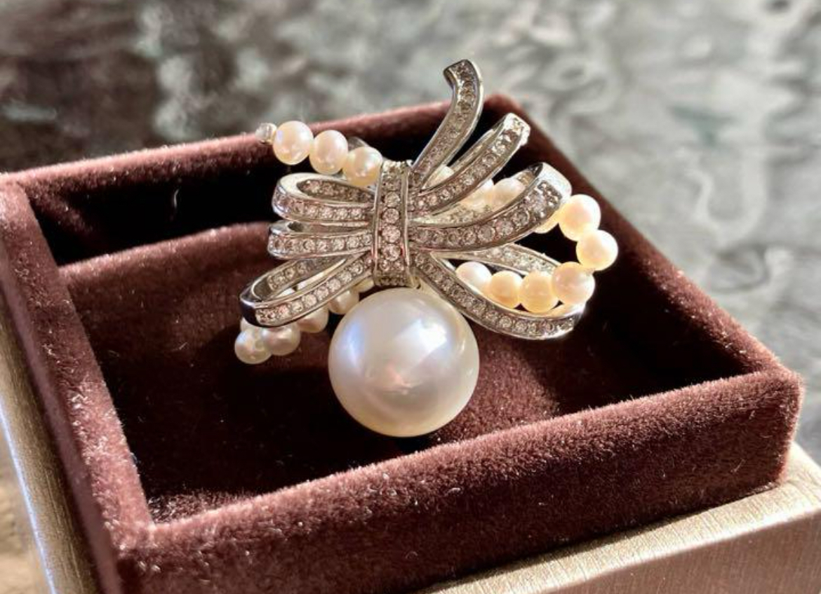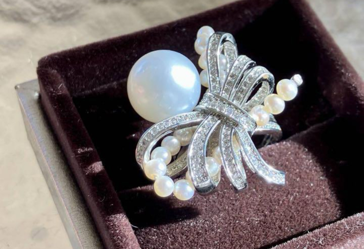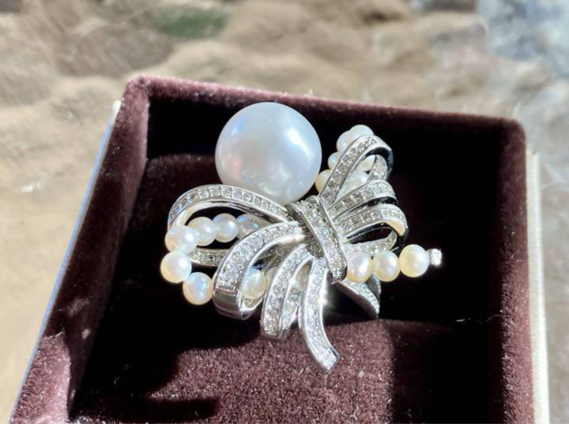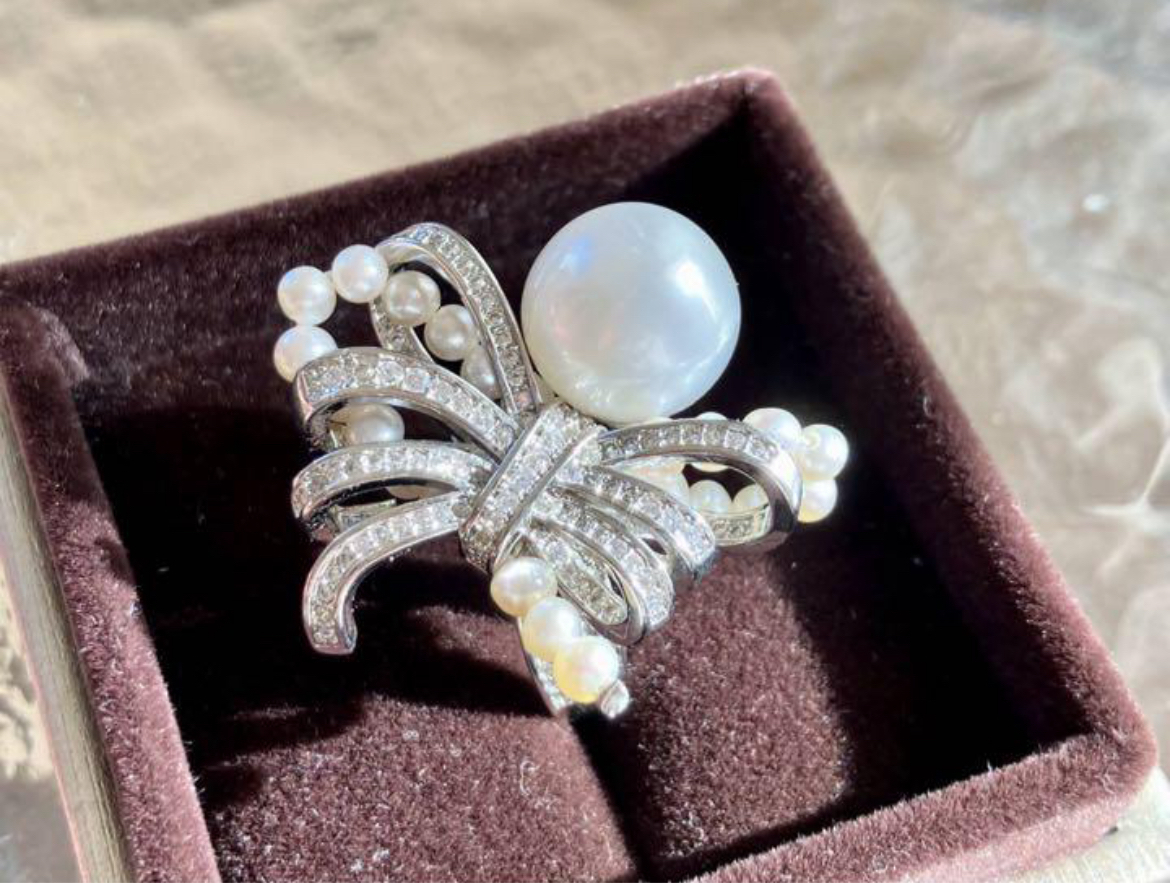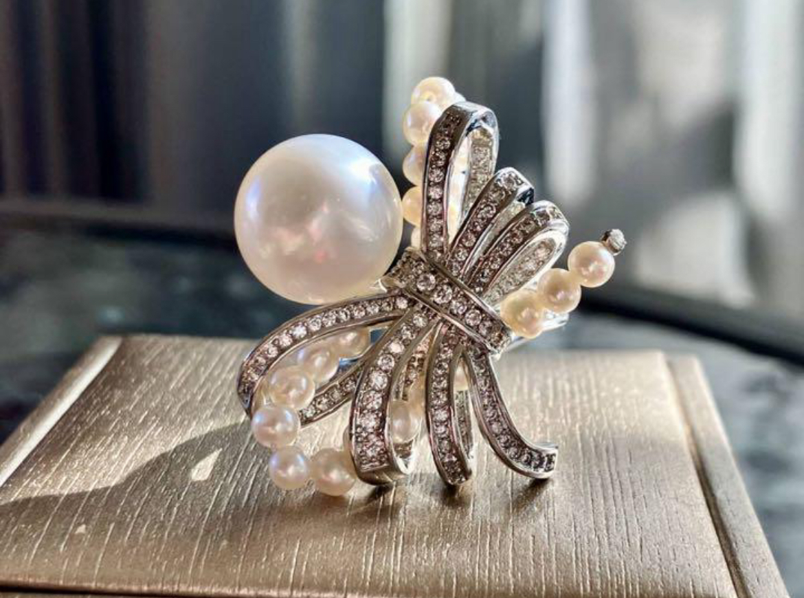 透明感、照りが抜群で、気品ある光沢を放つ白蝶真珠で作り上げたとても贅沢なリングです。デザイン性が高く存在感がしっかりあります。気品あふれる逸品を是非ご堪能ください。