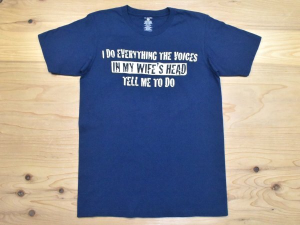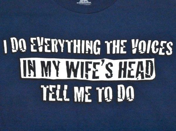 「私は妻の頭の中の声が私に指示することをすべて実行します(google翻訳)」というメッセージがプリントされた一枚です。