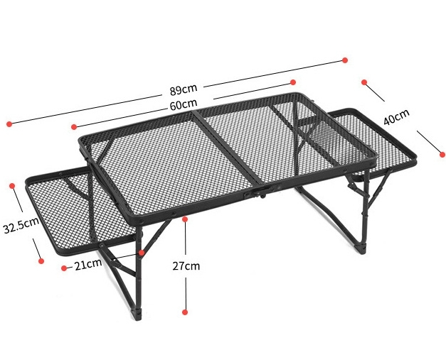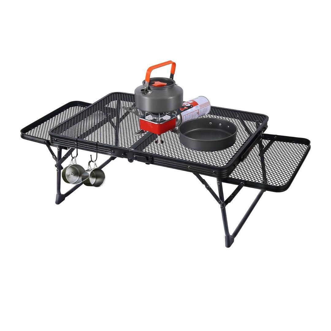 取り付けや取り外しが簡単であまり時間がかからない。折り畳み式テーブルなので収納後の体積が小さく、場所取らずに収納でき、持ち運びにも便利です。従来のキャンプテーブルと比べて、両側に2つの小さなテーブルボードを追加してスペースを増やし、長いキャンプテーブルより安定性に優れ、より多いアイテムを置くことができます。