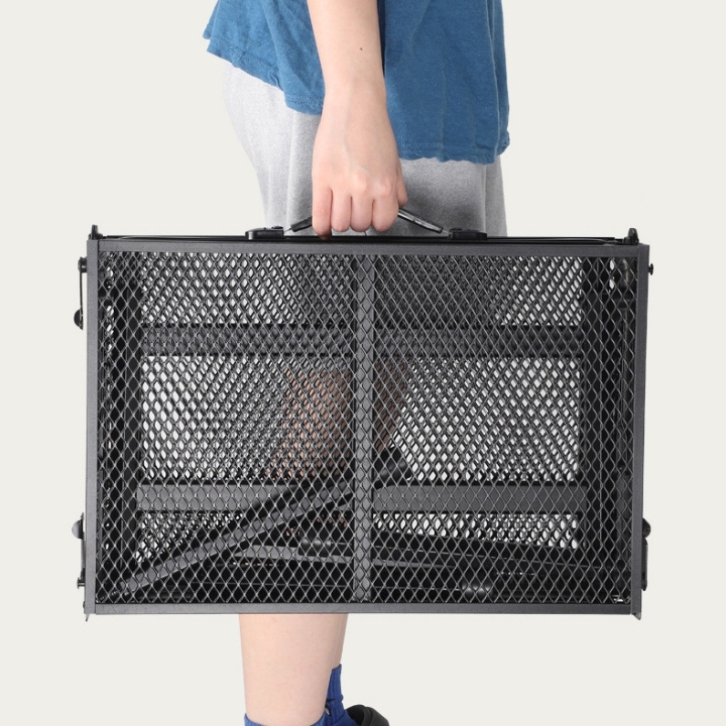 アルミ製キャンプテーブルは、軽さかつ耐久性に優れているのが特徴。手触りがよくて傷や汚れがつきにくく、メッシュ天板デザインで耐熱温度が300℃まで達し、錆びにくい、水と熱にも強いので、調理したばかりのフライパンや鍋をその上に置くのもオッケー。おしゃれな見た目でお手入れも簡単、汚れても丸々水洗いができ、実用性と耐久性を両立しています。