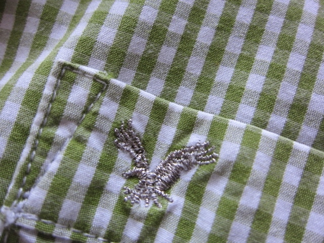 ブランドマークはシルバー糸で施されてます。タグ部分に替えのボタン×2個あり