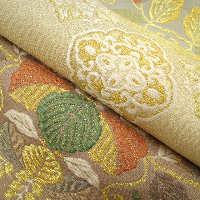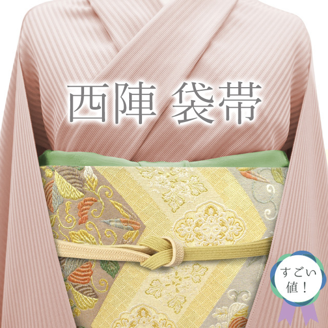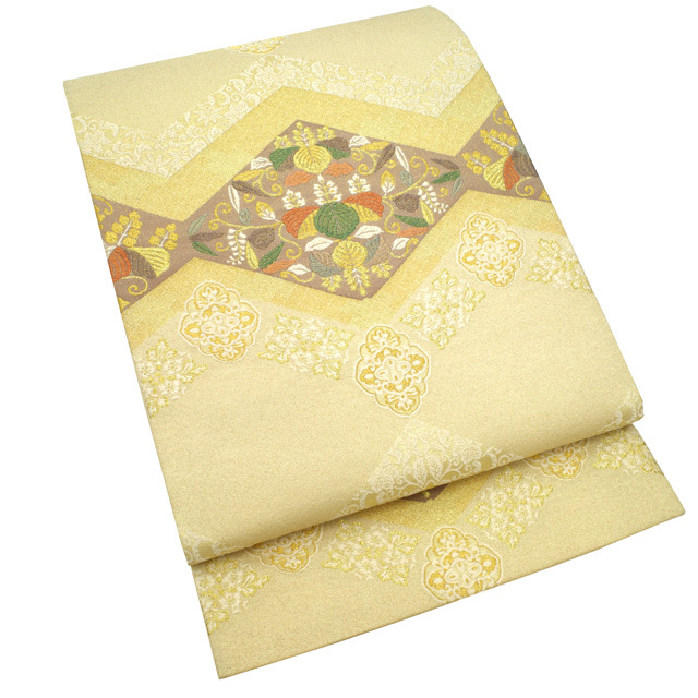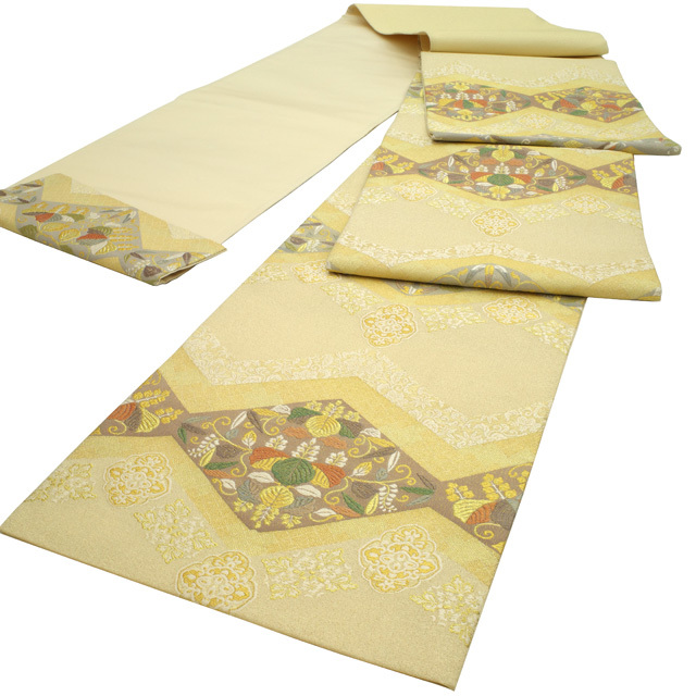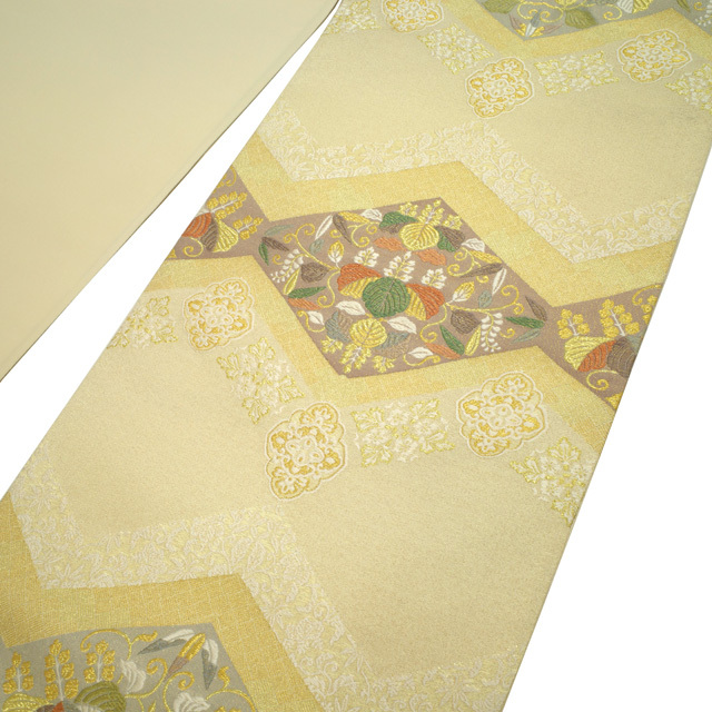 【中古】 すごい値! 袋帯 リサイクル フォーマル 京都 西陣 正絹 上質な帯地 ライトベージュ地 菱 桐 華文 金糸 六通柄 仕立て上がり 春 秋 冬 結婚式 お茶会 入学式 卒業式 七五三 お祝い パーティー などのフォーマルな場面に 販売 購入 綺麗 美品 たとう紙付き 送料無料 リユース すごいね みやがわ neb01177