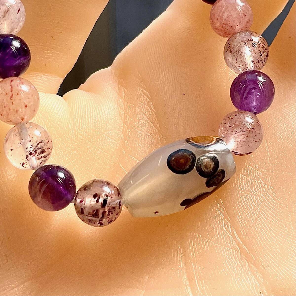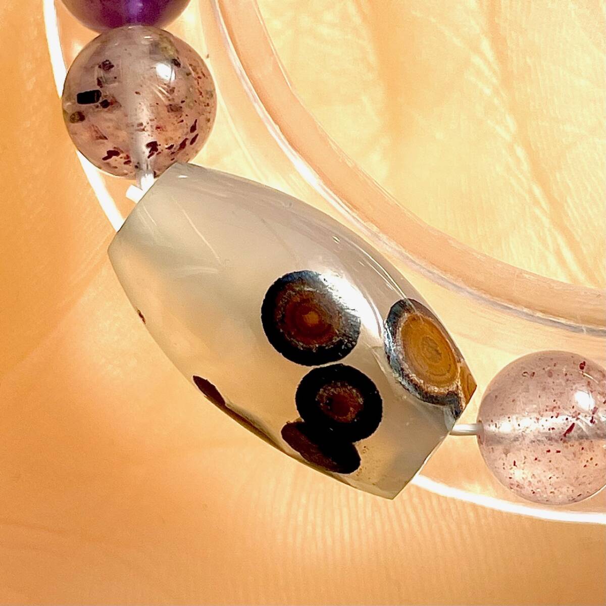 究極の天珠とされ、起源は老天珠より古く、チベットの祖先より収集されていた超希少な石です。モンゴル自治区の天然の天眼白瑪瑙は数億年をかけて出来るため、その数は非常に少なく価値は年々急上昇しています。大幸運と大富豪、心身のお守りで、そのパワーは老天珠と対をなすと言われるほど