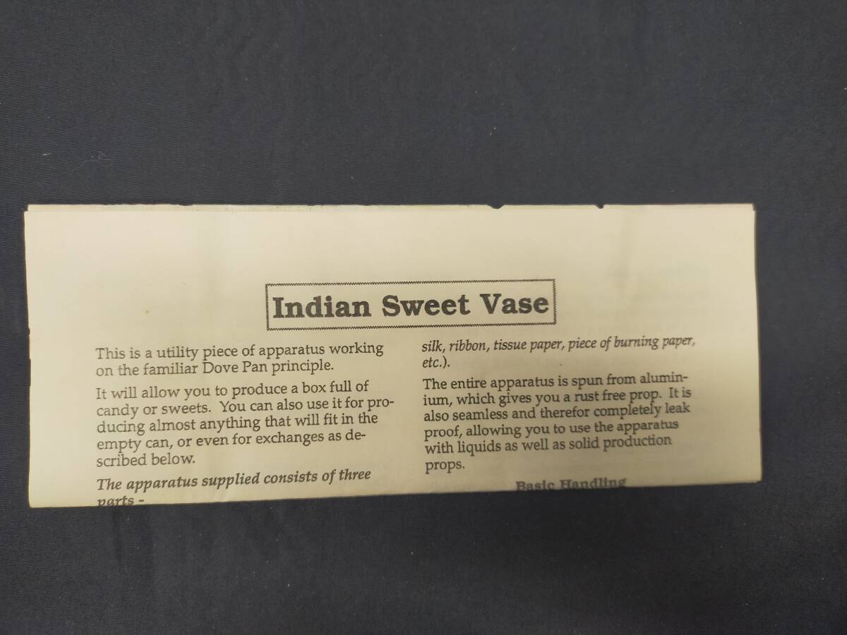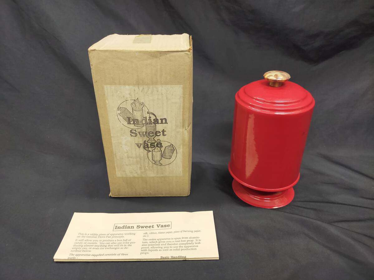 美しく塗装された金属製の筒状の容器(高さ21.5cm・直径11.5cm)が完全にカラなことをよく見せ、容器の中に火の点いた紙を投げ入れます。そして、容器にスッポリかぶさるフタをして、火を消します。フタを取ると、容器の中からいろいろなものが出現!