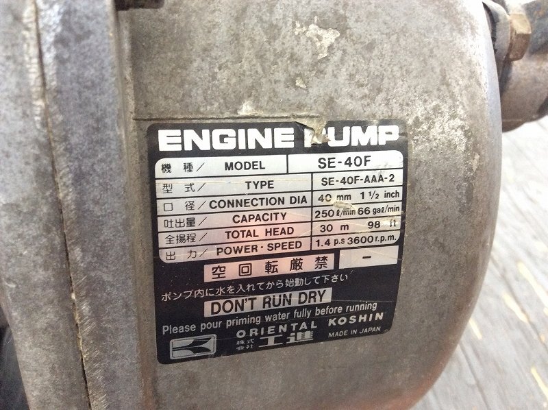 ・KOSHIN/工進/コーシン/エンジンポンプ/口径40mm/全揚程30m/SE-40F/ロビンエンジンEY08D搭載/2馬力 です。       EH22