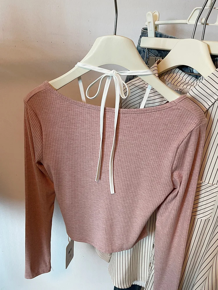 ホルターネック リボン フリル カットソー 韓国 春 夏 秋
