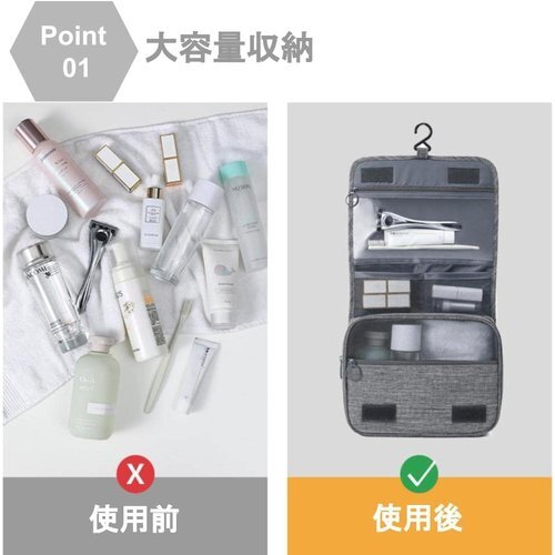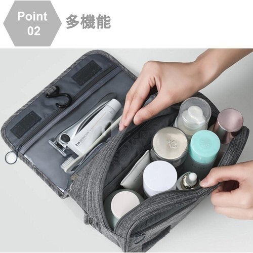 【多機能&大容量】旅行や出張などに持っていく化粧品やトラベルグッズは全て収納可能です。防水用のシッパー付き収納スペースがありますので歯ブラシなど、濡れるものを安心して持ち運ぶことが出来ます。その他にもポケットがいくつかあるので用途に応じてご使用いただけます。