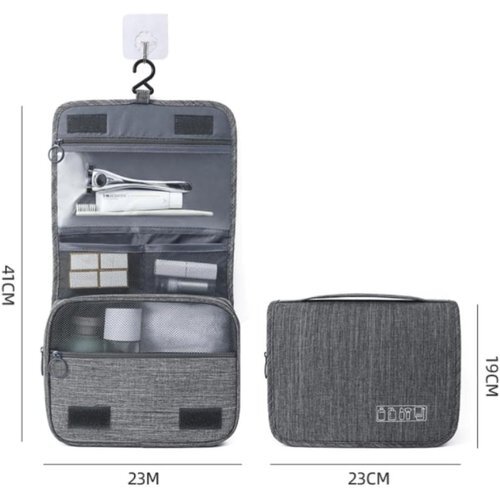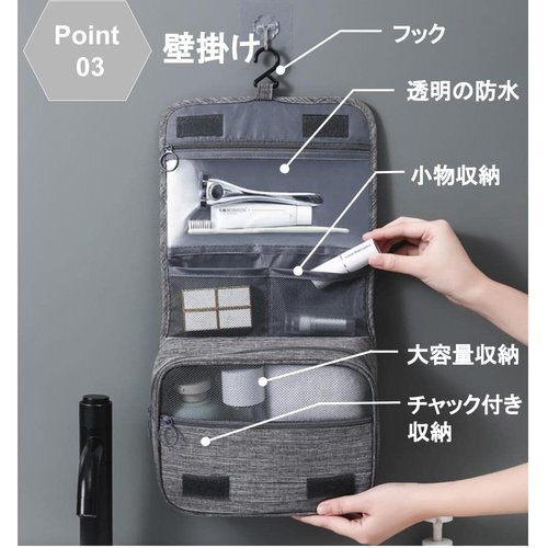 【多機能&大容量】旅行や出張などに持っていく化粧品やトラベルグッズは全て収納可能です。防水用のシッパー付き収納スペースがありますので歯ブラシなど、濡れるものを安心して持ち運ぶことが出来ます。その他にもポケットがいくつかあるので用途に応じてご使用いただけます。 【壁掛け可能】吊り下げ用のフック付きなので引っ掛けて使用することが可能です。ものの出し入れしやすいです。 【商品詳細】本体1個、サイズ:横幅23cm×高さ19cm