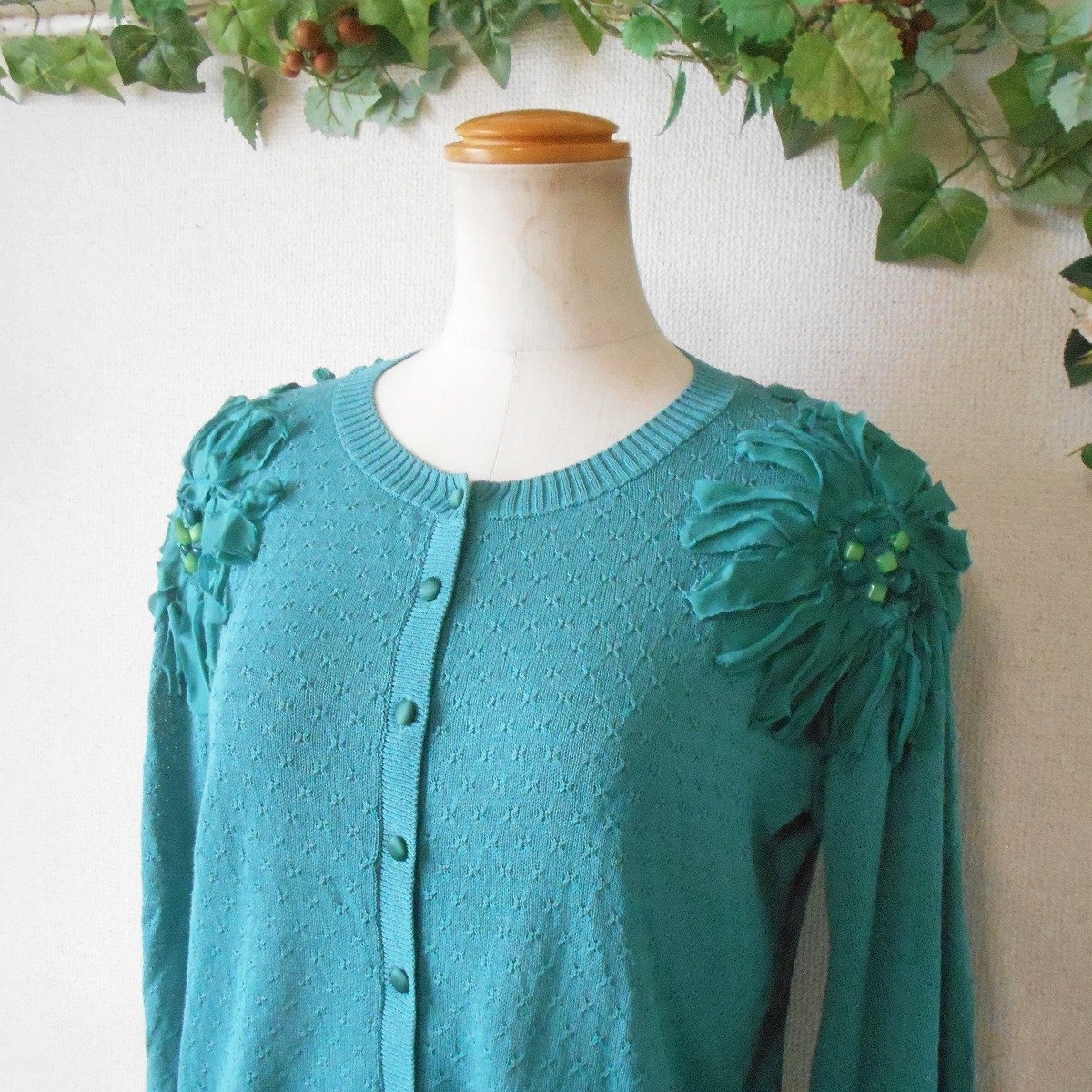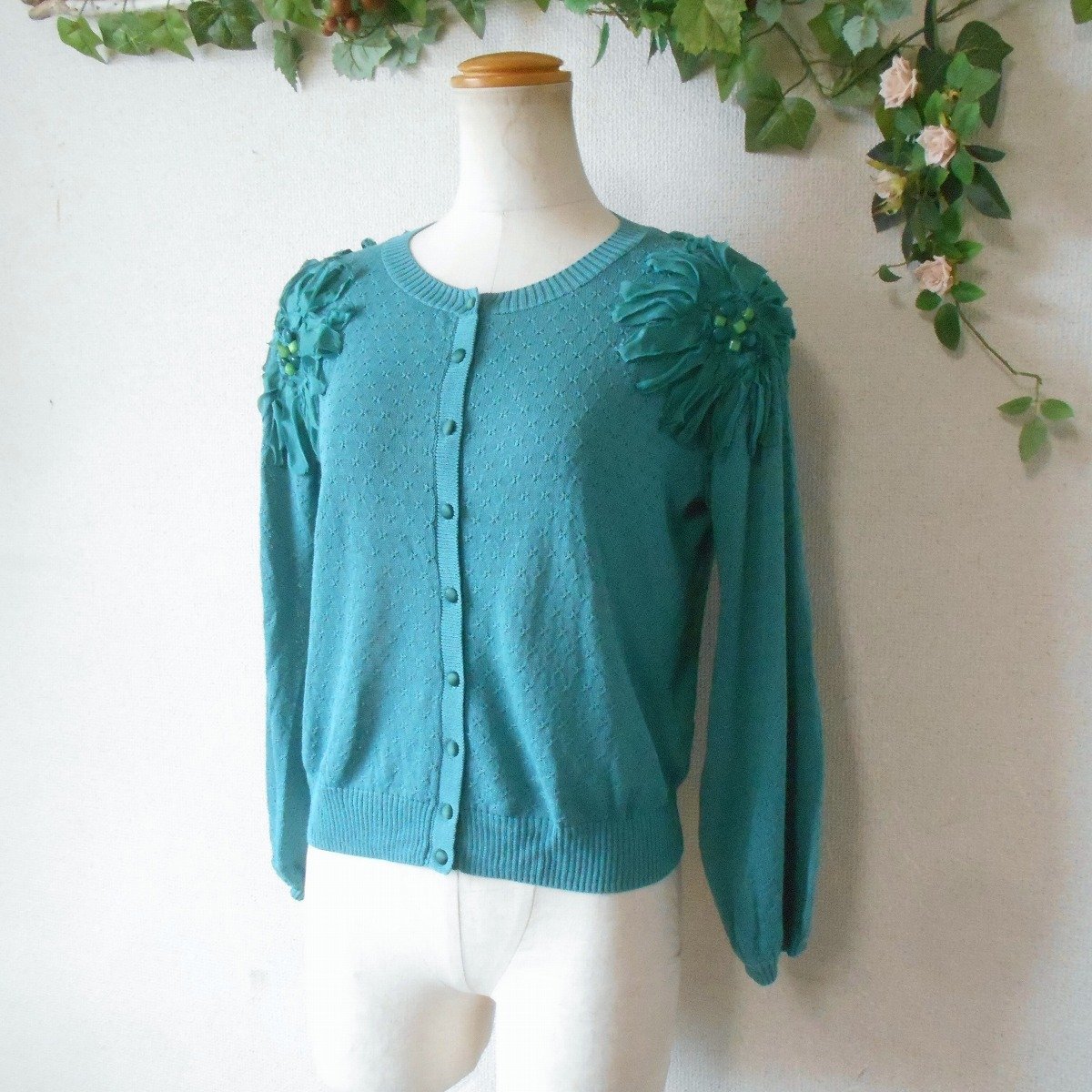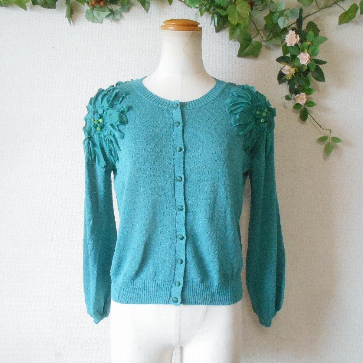 【ポイント】ホコモモラのレディース用カーディガンになります。お色はターコイズグリーンで春夏を中心に着ていただけるお品です。両肩の前後にお花のモチーフが付いたとっても素敵なデザインです。