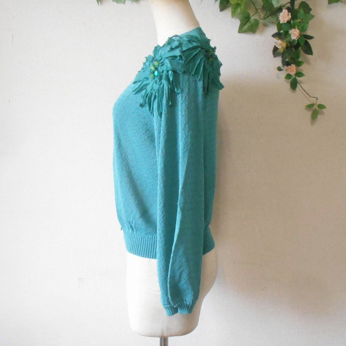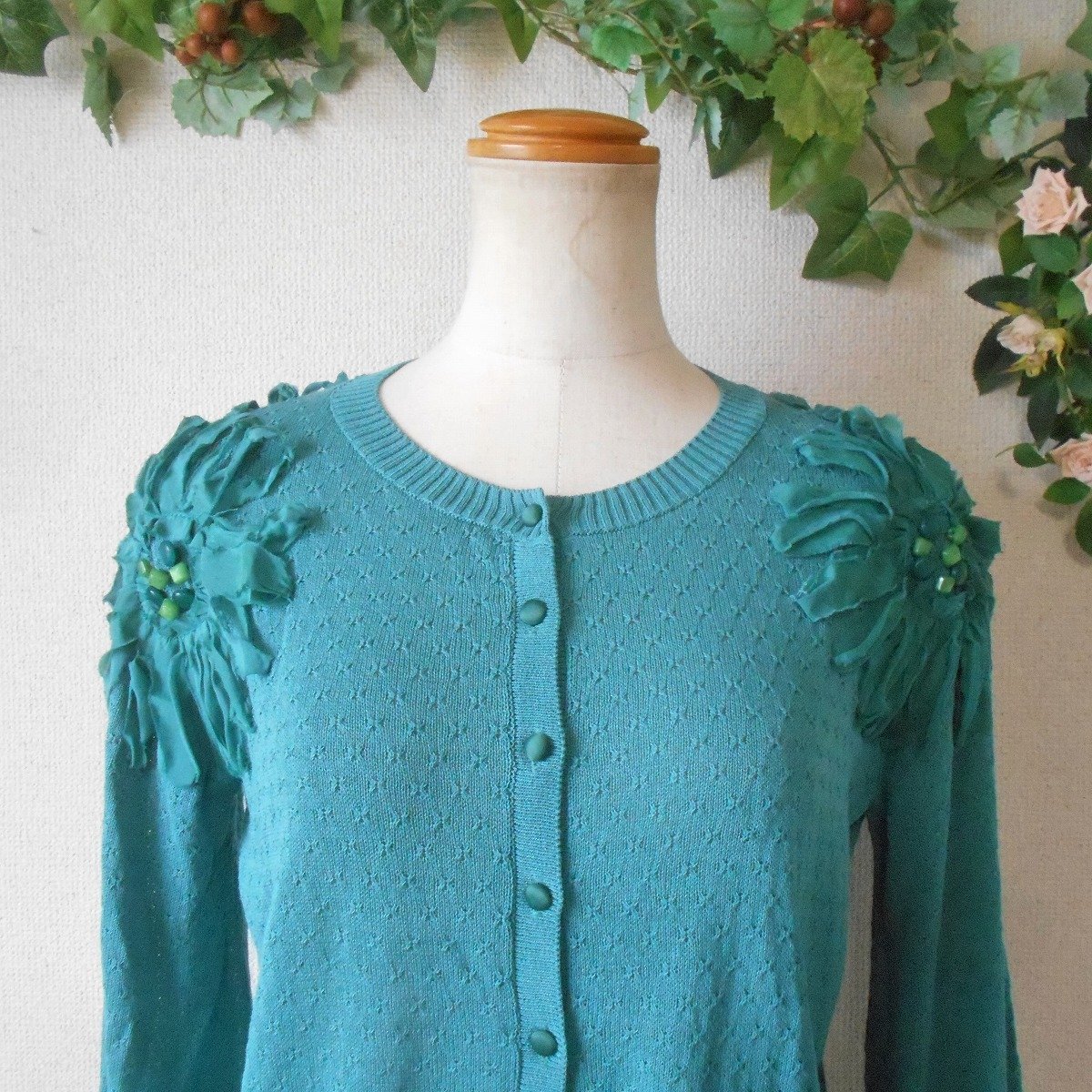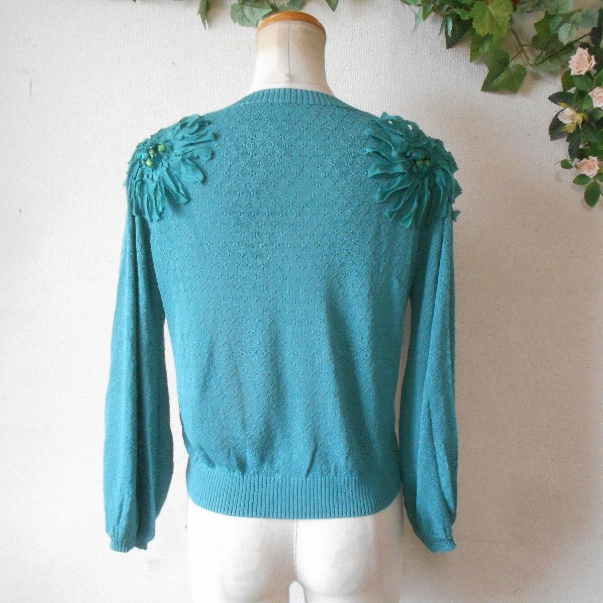 【ポイント】ホコモモラのレディース用カーディガンになります。お色はターコイズグリーンで春夏を中心に着ていただけるお品です。両肩の前後にお花のモチーフが付いたとっても素敵なデザインです。