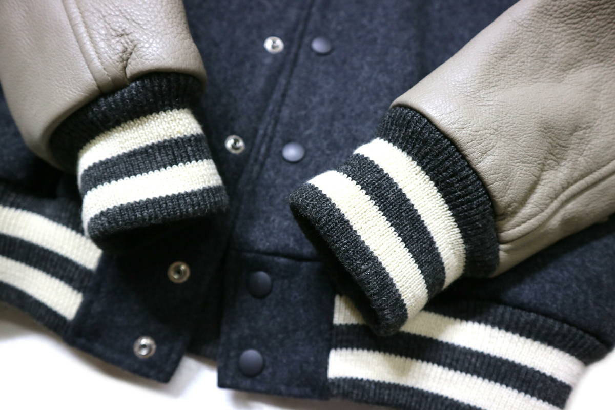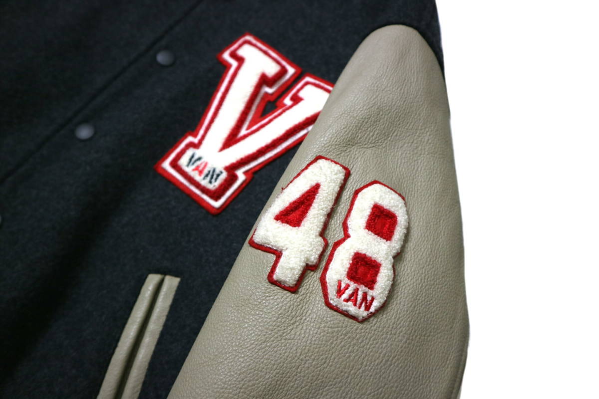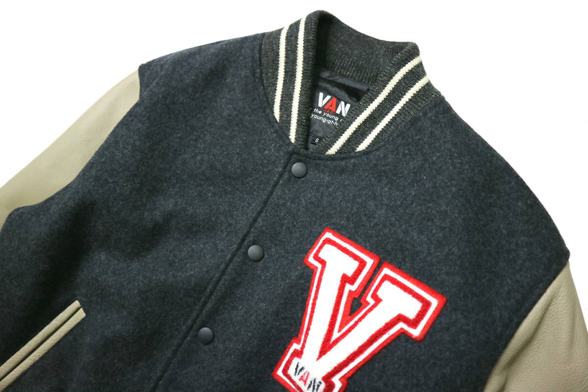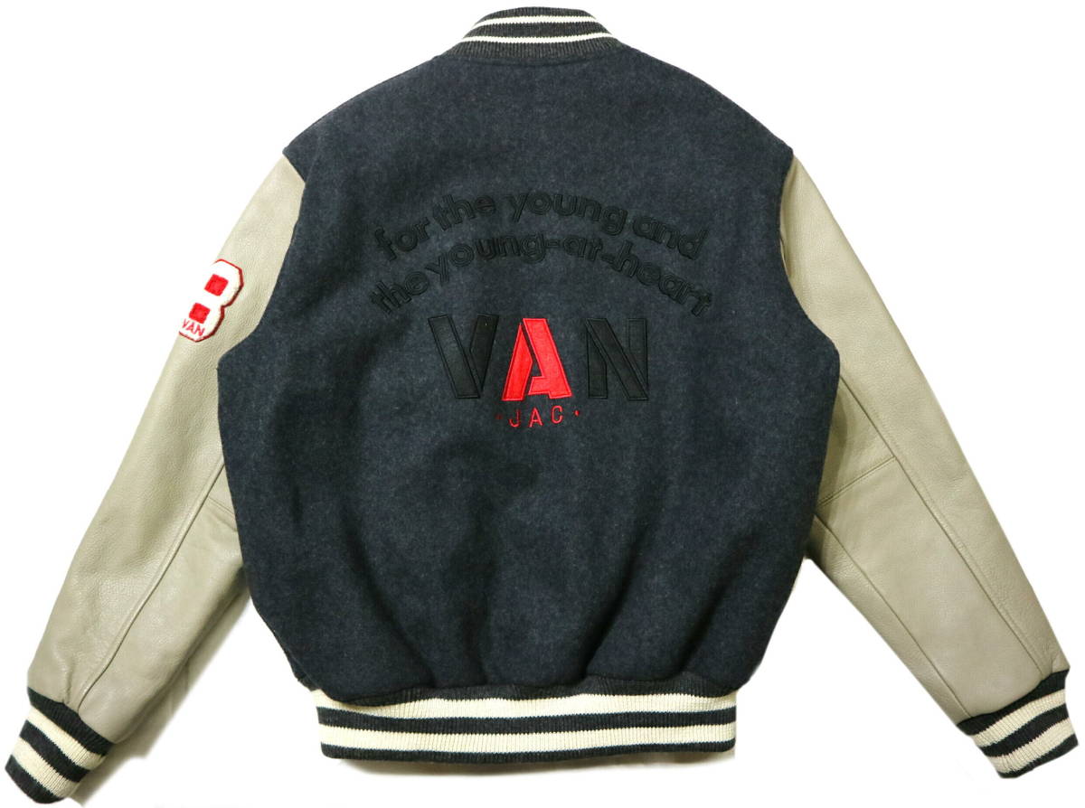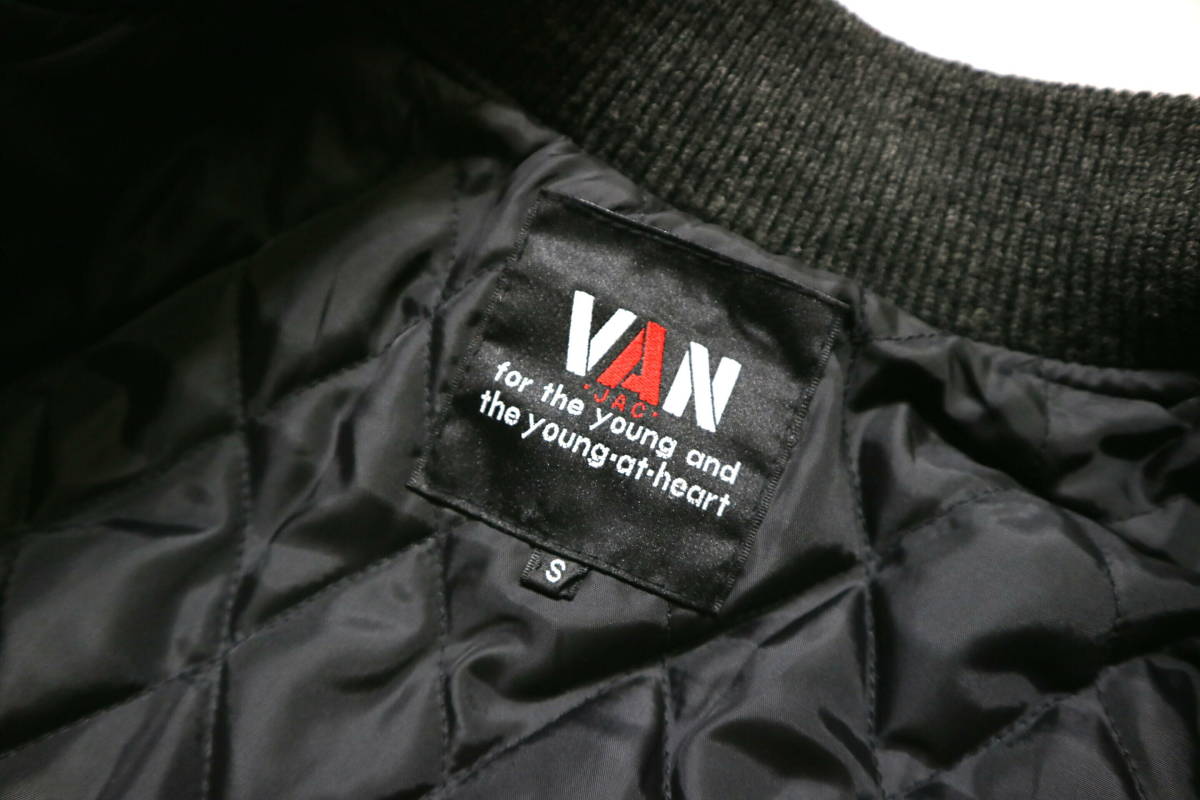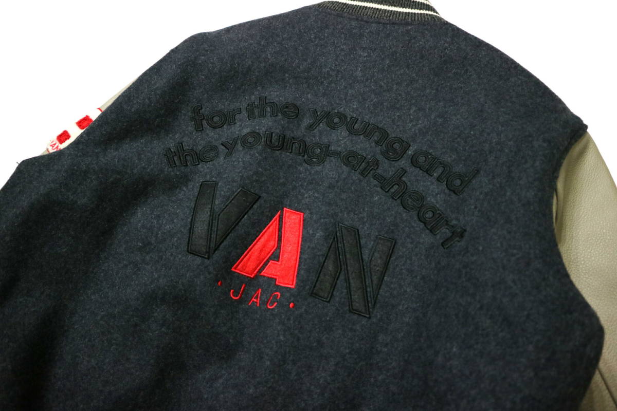 ・密でしっかりとした気持ち厚手のメルトン生地と質の良い袖牛革の組み合わせ、程よいレタード感の雰囲気の良い作りです。VAN JACの袖革スタジャンです。