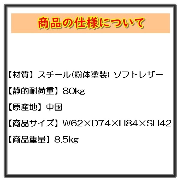 ![]() チェア CHA-301 ブラック 商品の仕様について 【材質】スチール(粉体塗装) ソフトレザー 【静的耐荷重】80kg 【原産地】中国 【商品サイズ】W62×D74×H84×SH42 【商品重量】8.5kg ◇◆発送について◆◇