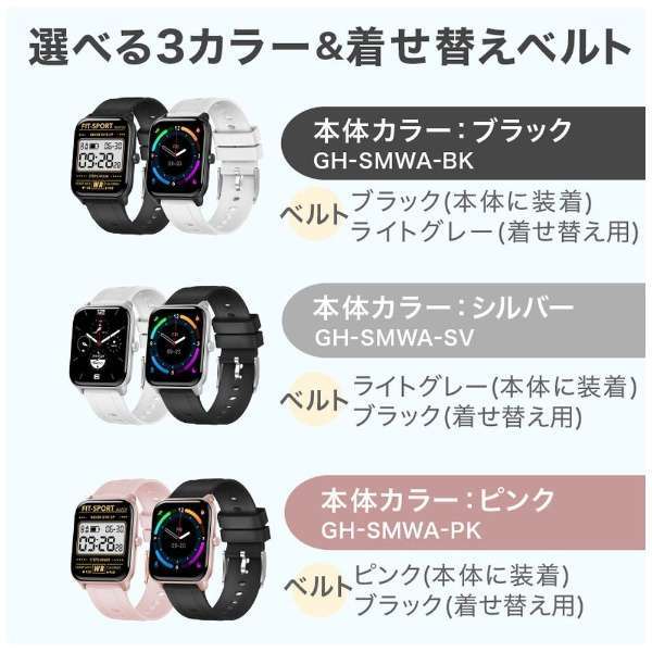 | グリーンハウス GREEN HOUSE GH-SMWA-BK スマートウォッチ スクエア ブラック 新品未開封品です。 外箱、テープに擦れや汚れ、剥がれがある場合があります。 <商品概要> 各種センサーで健康管理をサポートする着せ替えベルト付きスマートウォッチ 電話の着信やメール、SNS、LINEなどのアプリ通知 Amazon alexa built in対応、音声でスマート家電などをコントロール 1.69インチフルタッチディスプレイ どこにあっても大丈夫 「本製品からスマホを探す」「スマホから本製品を探す」機能 安心の専用日本語アプリ「GH Smart」 防水防塵等級IP68* スマートフォンの音楽再生を操作できる スマートフォンのカメラのリモートシャッター 20種類のスポーツ(エクササイズ)モードで活動量の計測ができる 長時間の座りすぎを教えてくれる座りすぎ通知機能 通知機能をオフにするサイレントモード 時計盤のデザイン変更 ストップウォッチ&タイマー機能 多言語対応(13言語) ※本製品のご使用には、スマートフォンとの連携が必須になります。 ・電話の着信やメール、SNS、LINEなどのアプリ通知 ・Amazon alexa built in対応、音声でスマート家電などをコントロール *付属のベルトのカラーは以下の様になります。 ・ブラック(-BK):ブラック〈本体装着済み〉/ ライトグレー 〈着せ替え用〉 ・シルバー(-SV):ライトグレー〈本体装着済み〉/ ブラック 〈着せ替え用〉 ・ピンク(-PK):ピンク〈本体装着済み〉/ ブラック 〈着せ替え用〉 ★商品の仕様等に関しては、商品名に基づきご自身でご確認のうえご入札をお願いいたします。 詳しくはこちらをご覧下さい。 ※万が一初期不良や不具合がありましたらメーカーにお問い合わせ下さい。 いかなる場合も返品には承れません。 落札後の挨拶は不要ですのでしないで下さい。 「よろしくお願いします」「入金しました」など不要なメッセージには返信しません。取引メッセージは緊急時のみですのでご了承ください。返信しないからと言って悪い評価、どちらでもない評価をつけられた場合はこちらから同等の評価をつけます。 | |