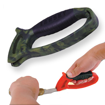 ランスキーのナイフシャープナー デラックス クイックエッジ。ナイフの刃を上向きにし、シャープナーのV部分を刃に当て、刃先に向かって滑らすだけで、簡単にタッチアップを行うことが出来ます。ラバー製のグリップで滑りにくく持ち手はラバー製で滑りにくい仕様。シャープナーにはランヤードホールが空いているので、パラコードなどの紐を通し、バックパックなどに取り付けることもできます。
