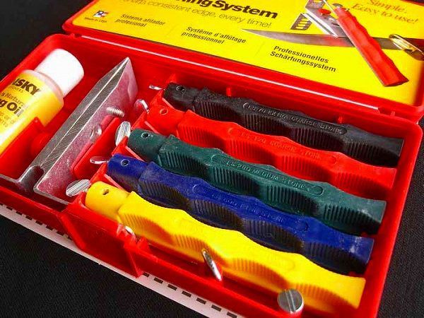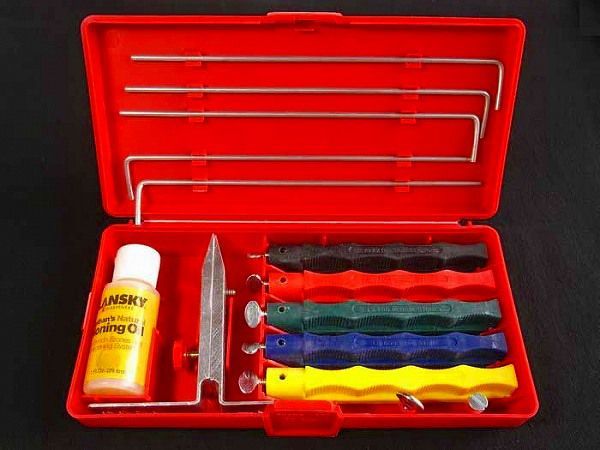 ランスキーシャープナーは、通常、日本では研ぐ刃物のほうを動かしますが、砥石を動かす斬新なシャープニングシステムです。ナイフを研ぐ際、砥石の角度がブレないようにガイドロッド(棒)で角度を固定、穴の位置を選ぶことで研ぎ角を変更できます。