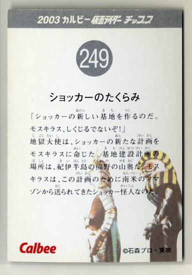 | ◆防水対策 厚紙補強 カルビー 仮面ライダーチップスカード(2003 復刻版) 249番 ショッカーのたくらみ トレカ 即決 | |