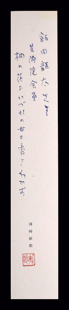 紙本肉筆未装短冊1葉 作品寸法:36.2cm x 6.0cm 紙背に清崎敏郎蔵印及び自筆書込み 商品状態:非常に良好な保存の美品です。 飯田龍太(いいだりゅうた) 1920―2007。俳人。山梨県生まれ。父は俳人の飯田蛇笏(だこつ)。国学院大学卒業。1941年(昭和16)より作句、1947年に『雲母(うんも)』の編集担当。1962年蛇笏の没後、『雲母』を継承し、主宰として優秀な俳人を輩出した。山梨県境川村(現、笛吹(ふえふき)市)に根をおろし、自然と向き合いながら感性豊かな作品をつくり続け、昭和俳句を代表する俳人として独自の作風を確立し、俳壇内外の高い評価を得るに至った。1992年(平成4)突然『雲母』の終刊を宣言して事実上俳壇から引退し、以後作品を発表しなかった。1957年第6回現代俳句協会賞、1969年第4句集『忘音』により第20回読売文学賞、日本芸術院賞恩賜賞などを受賞。日本芸術院会員。句集に『百戸の谿(ひゃっこのたに)』(1954)、『忘音』(1968)、『今昔』(1982)、『山の影』(1985)、『遅速』(1991)など。随筆集『無数の目』(1972)など。 出典:日本大百科全書(ニッポニカ) 清崎敏郎(きよさきとしお) 1922-1999。昭和-平成時代の俳人。大正11年2月5日生まれ。高浜虚子,富安風生に師事し,「ホトトギス」同人。昭和54年風生の没後は「若葉」主宰をつぎ,花鳥諷詠と客観写生の理念をつらぬいた。平成10年「凡」で俳人協会賞。母校慶大の講師,同大付属高教諭をつとめた。平成11年5月12日死去。77歳。東京出身。本名は星野敏郎。句集に「安房上総(あわかずさ)」「東葛飾(かつしか)」など。 出典:講談社『デジタル版 日本人名大辞典+Plus』 |