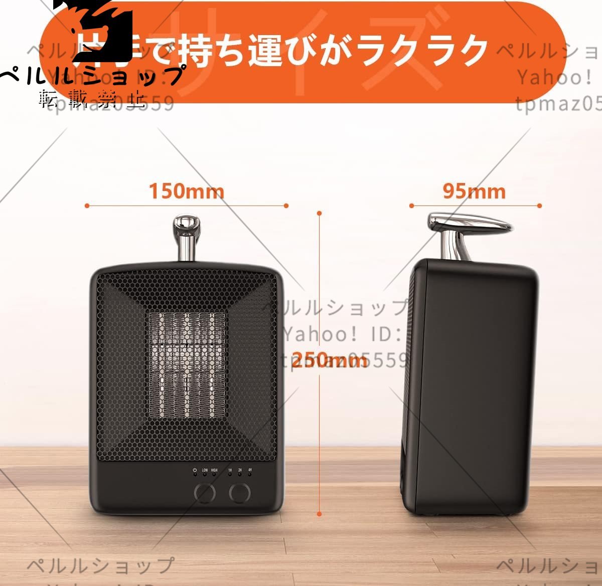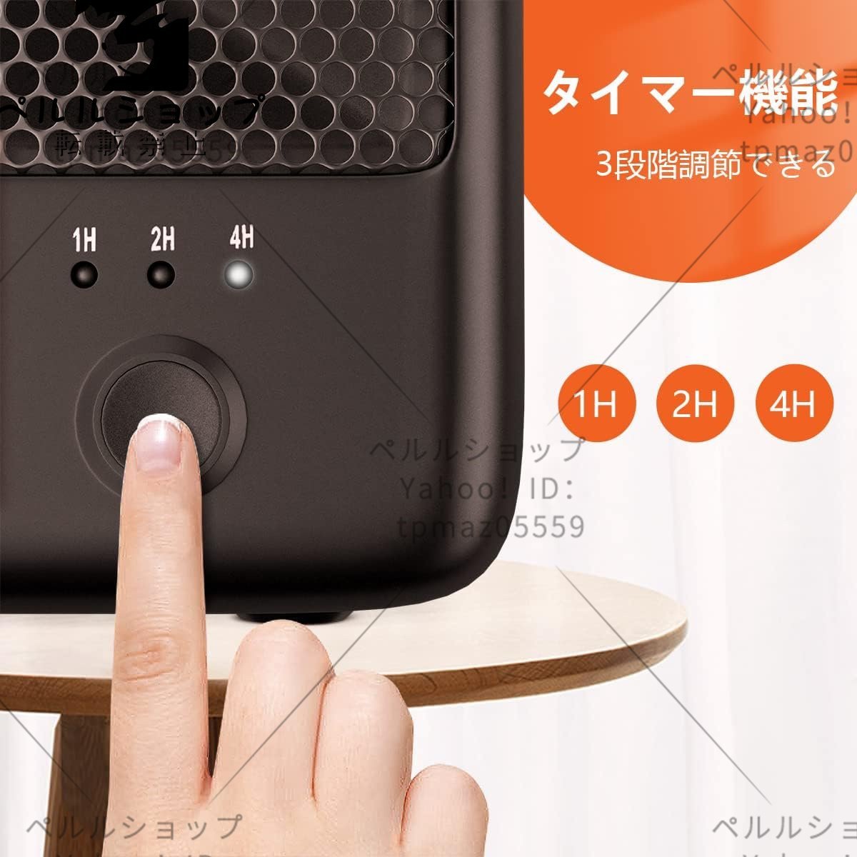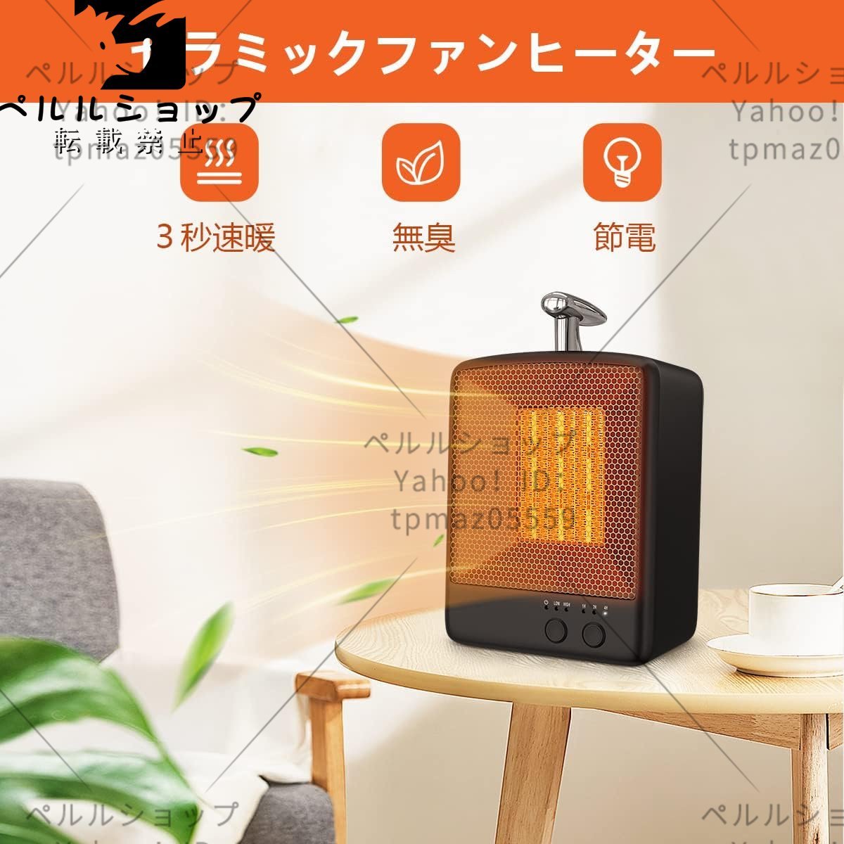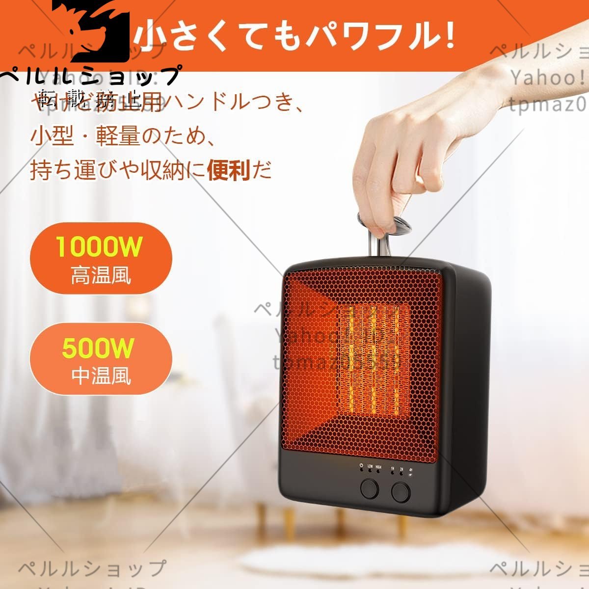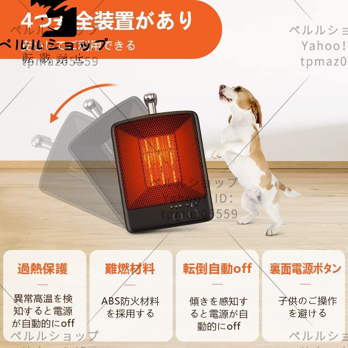 【安心させセーフティー機能】?温度過昇防止装置(サーモスタット)。周囲や内部の温度が70℃を超えた時、サーモスタットが働き、ヒーターが自動的に停止します。?転倒OFFスイッチ。本体は30°に倒れた時、電源が自動offになります。転倒/本体に傾けたら、自動電源遮断機能が起動し、その時、本体を 平らにし、温風/タイマーの再設定をしてください。?ABS難燃材料を採用し、火事防止できます。?裸火なし。PTCセラミックが採用され、直火がありません。火事や火傷のリスクを排除して、子供やペットのいる家庭にも安心的にご利用いただけます。