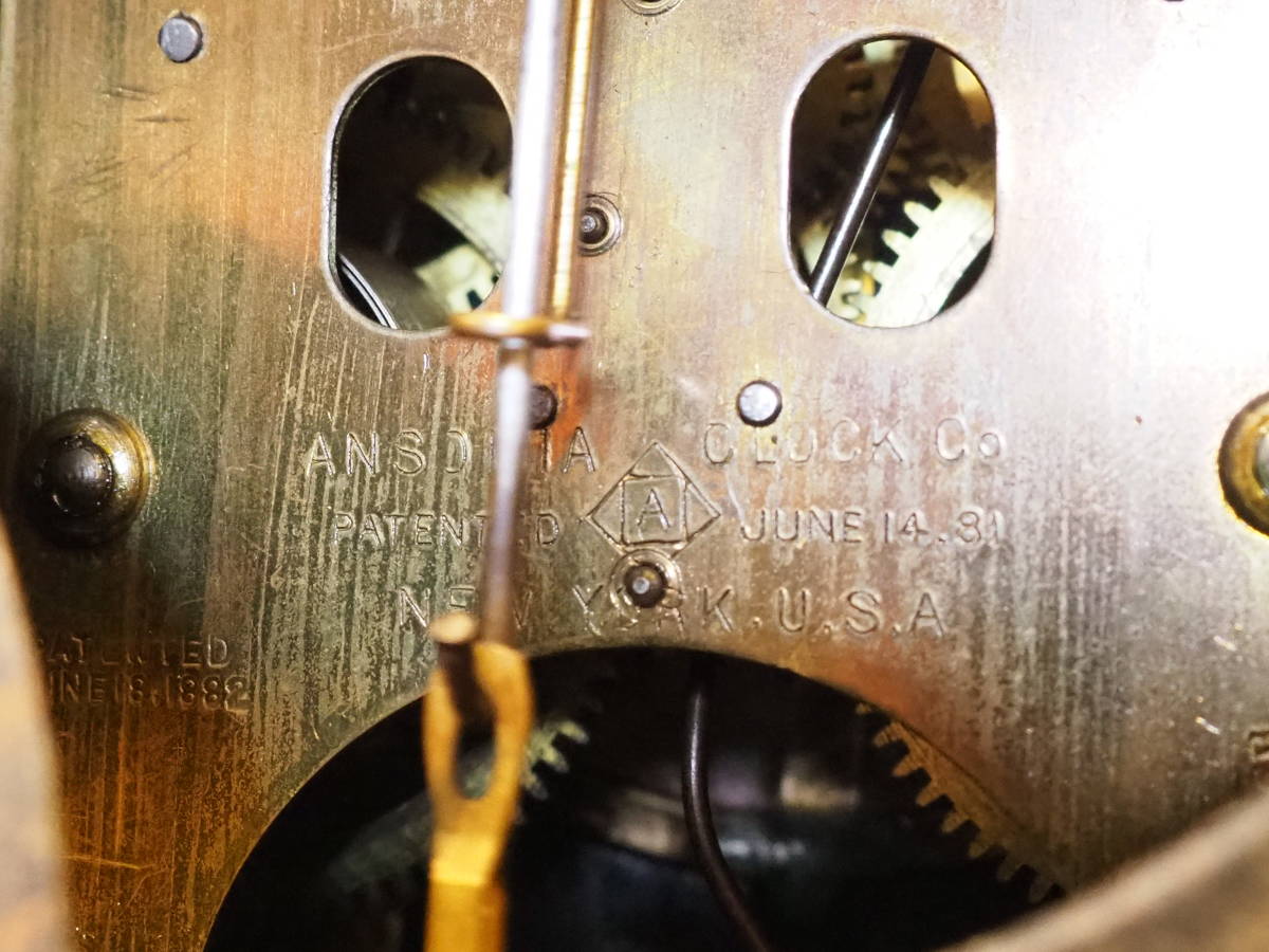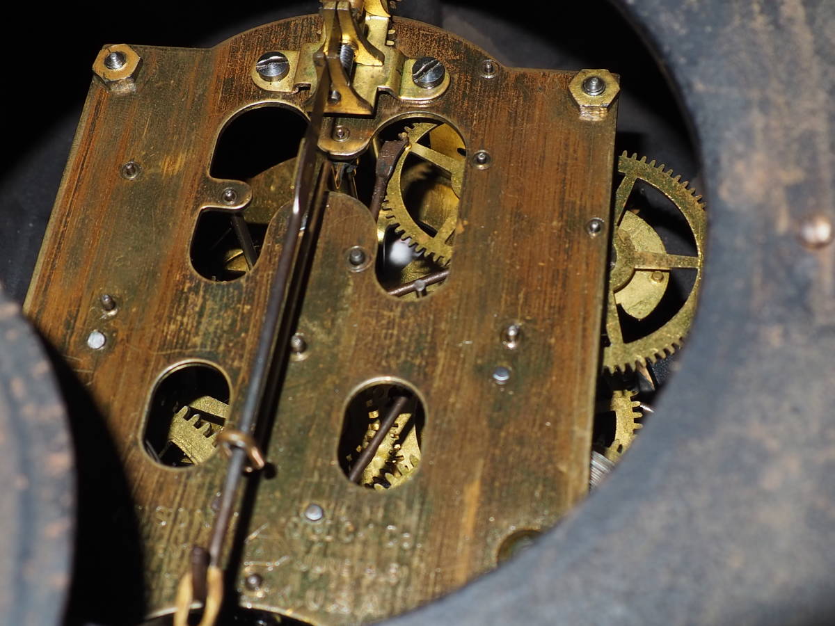 正面ガラス窓を開け、4時の位置が針のゼンマイ、8時の位置が時報の鐘を打つゼンマイです。