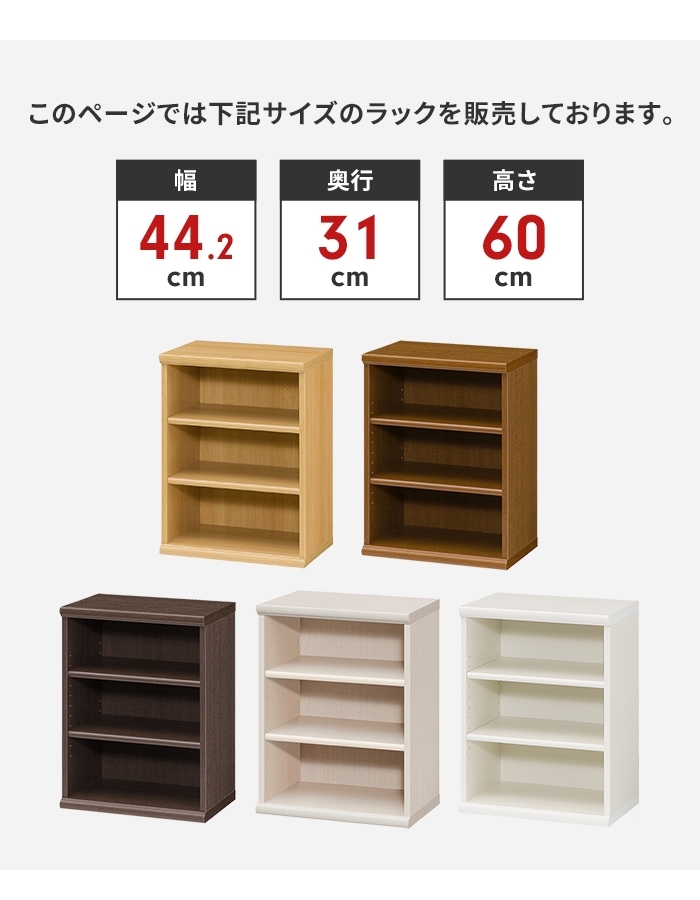 ※【同シリーズ】のリンクは当店のヤフオク店のページへ進みます。 エースラック/カラーラック 【本体(奥行31cm※共通)】 ● 高さ60cm 幅28.6cm/幅44.2cm/幅59.2cm/幅86.5cm/幅116.5cm ● 高さ88.1cm 幅28.6cm/幅44.2cm/幅59.2cm/幅86.5cm ダイワ/幅116.5cm ダイワ ● 高さ117cm 幅28.6cm/幅44.2cm/幅59.2cm/幅86.5cm ● 高さ149.9cm 幅28.6cm/幅44.2cm/幅59.2cm/幅86.5cm ● 高さ178cm 幅28.6cm/幅44.2cm/幅59.2cm/幅70.2cm/タフ 幅70.2cm/幅86.5cm ● 高さ200cm 幅28.6cm/幅44.2cm/幅59.2cm/幅70.2cm/タフ 幅70.2cm/幅86.5cm 【追加棚(奥行27.8cm※共通)】 ● 厚さ1.7cm 幅24.9cm(本体幅28.6cm用)/幅40.5cm(本体幅44.2cm用)/幅55.5cm(本体幅59.2cm)/幅66.5cm(本体幅70.2cm) ● 厚さ2.5cm(タフ) 幅66.5cm(本体幅70.2cm) ※このページは[本体(高さ60cm/幅44.2cm)]を販売しております。 |